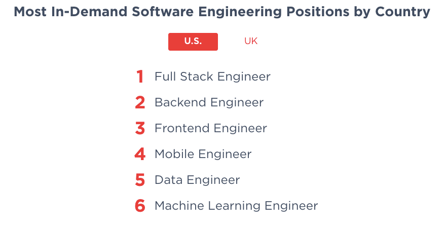 美国最受欢迎的软件工程职位Top 6:全栈工程师、后端工程师、前端工程师、移动工程师、数据工程师、机器学习工程师。