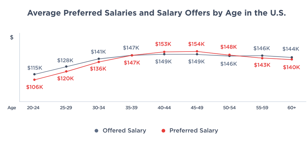 报告显示,40岁是一个拐点。在40岁之前,你的薪资可能一直呈现增长态势。但越接近40岁,增长越放缓。过了40岁后,薪资不仅停止增长,甚至还出现了下降的趋势。60岁的薪资已经基本回落到30岁时候的薪资。