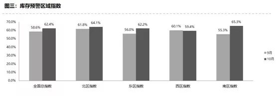 从区域指数情况看:调查显示,10月份全国总指数为62.4%,北区指数为64.1%,东区指数为62.2%,南区指数为65.3%,西区指数为59.4%。