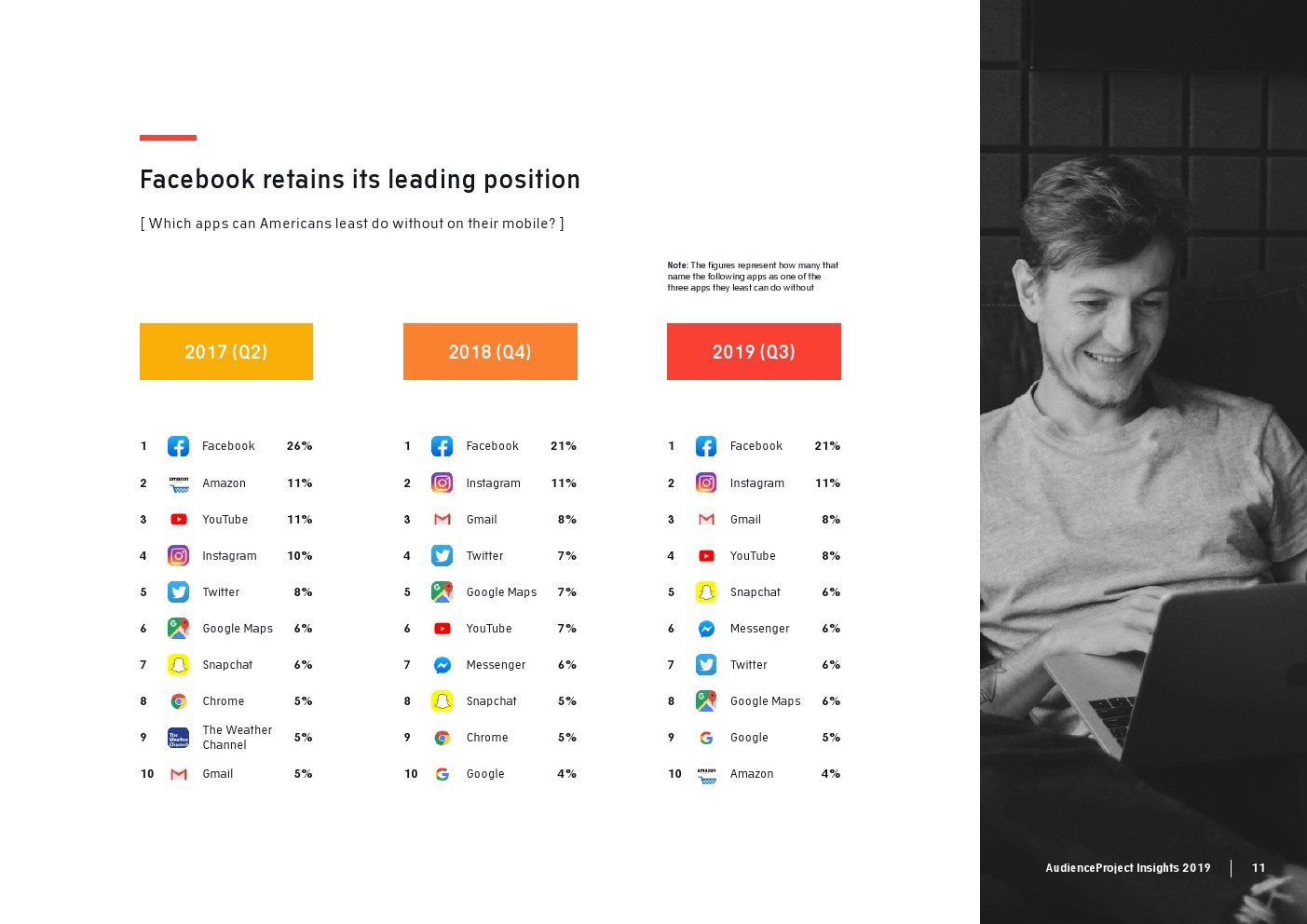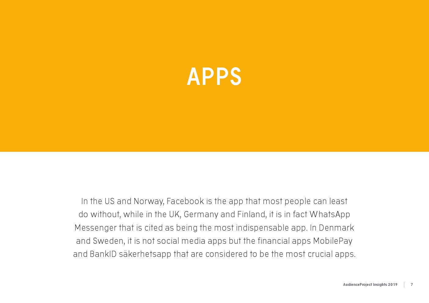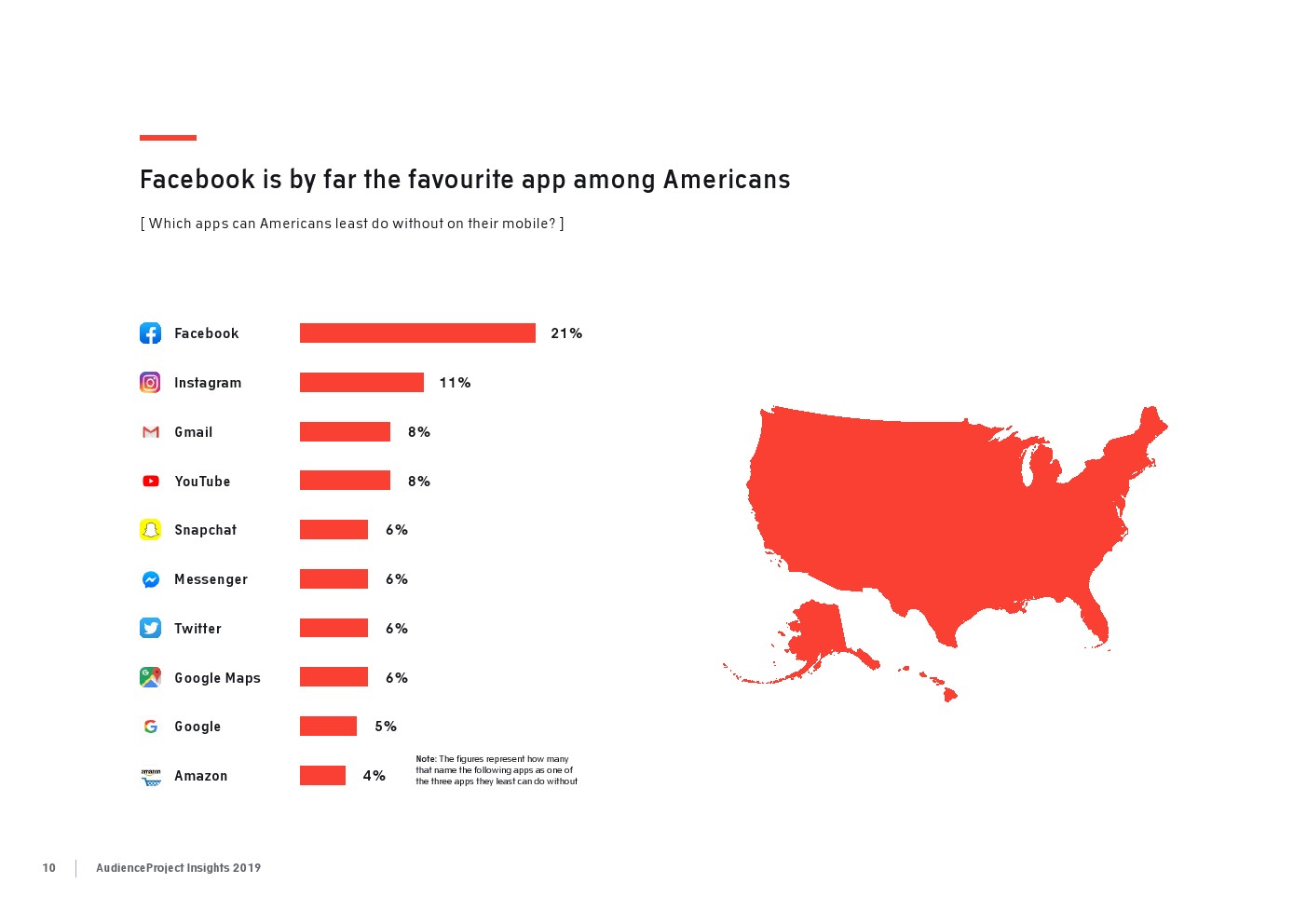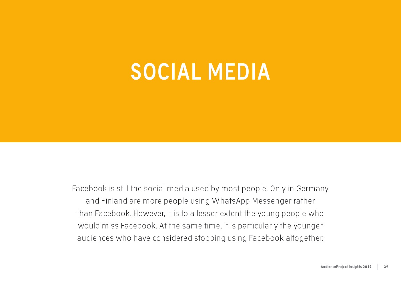 AudienceProject发布了“2019年应用和社交媒体使用报告”。尽管7/10的美国成年人仍在使用Facebook,但它吸引力已经有所下降。AudienceProject对来自美国和欧洲的1.3万名15岁及以上的社交媒体用户的研究表 明,Facebook不再像过去那样不可或缺。