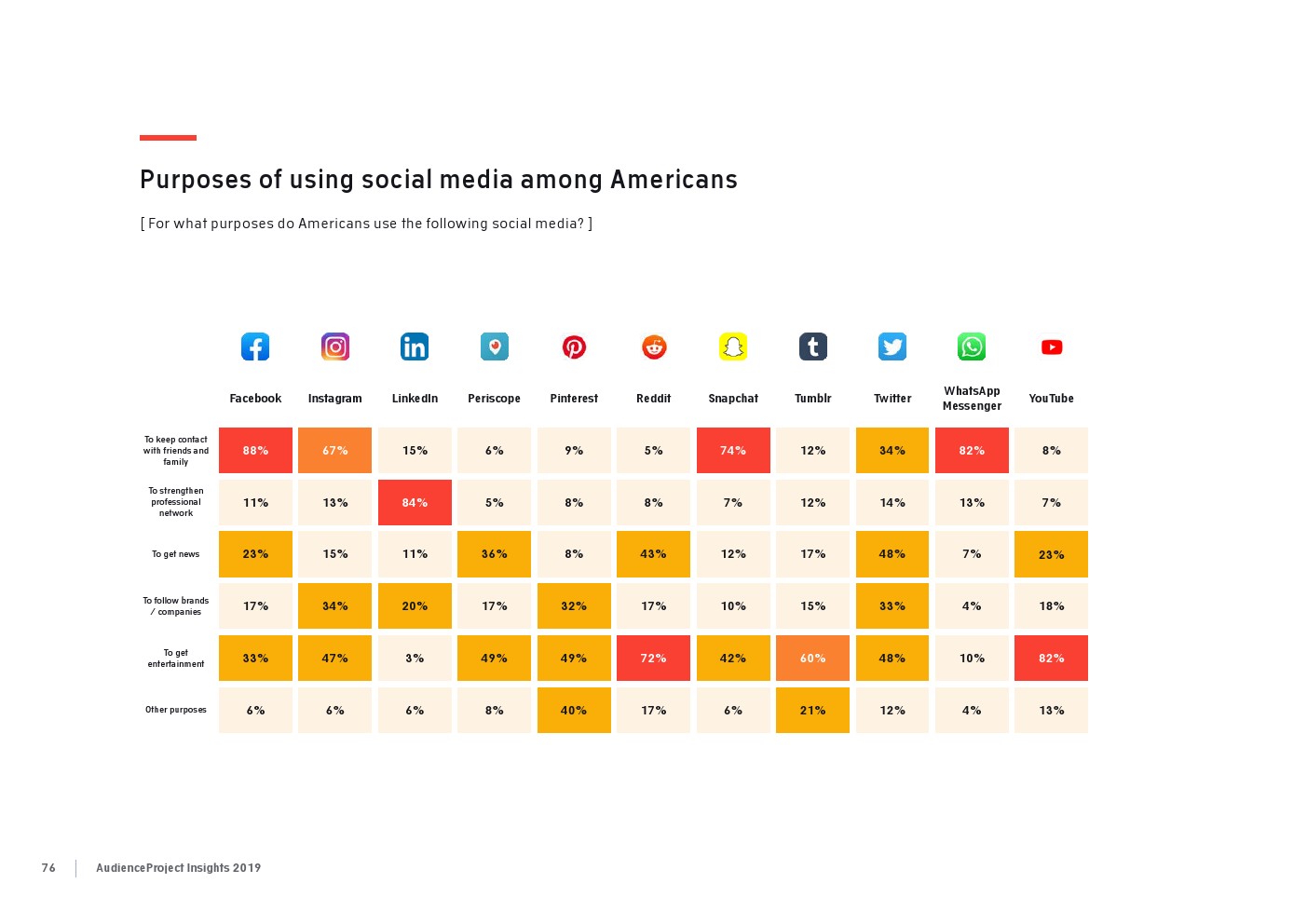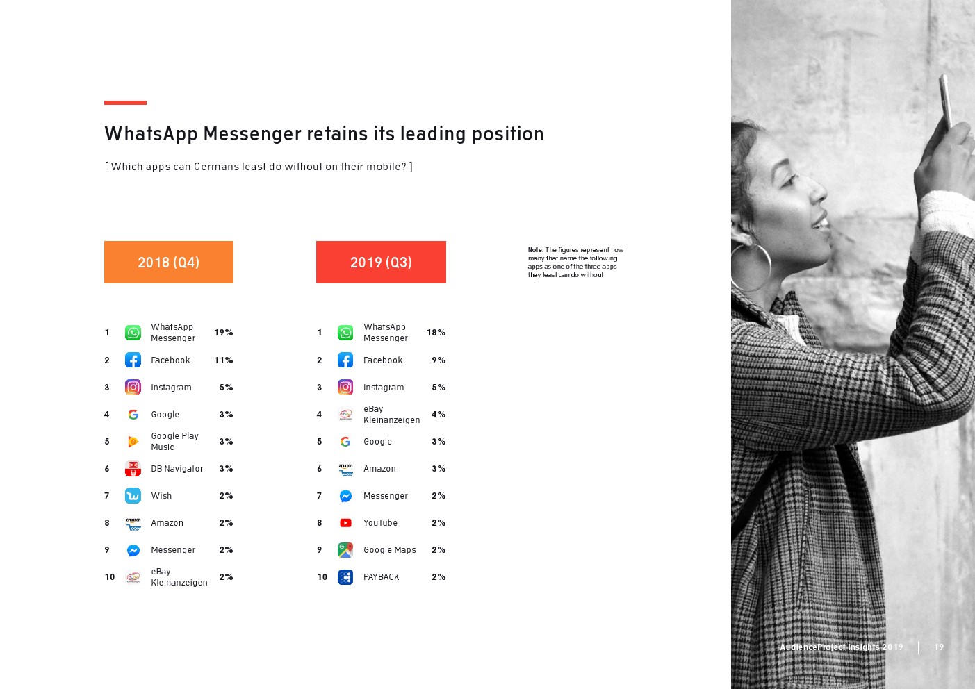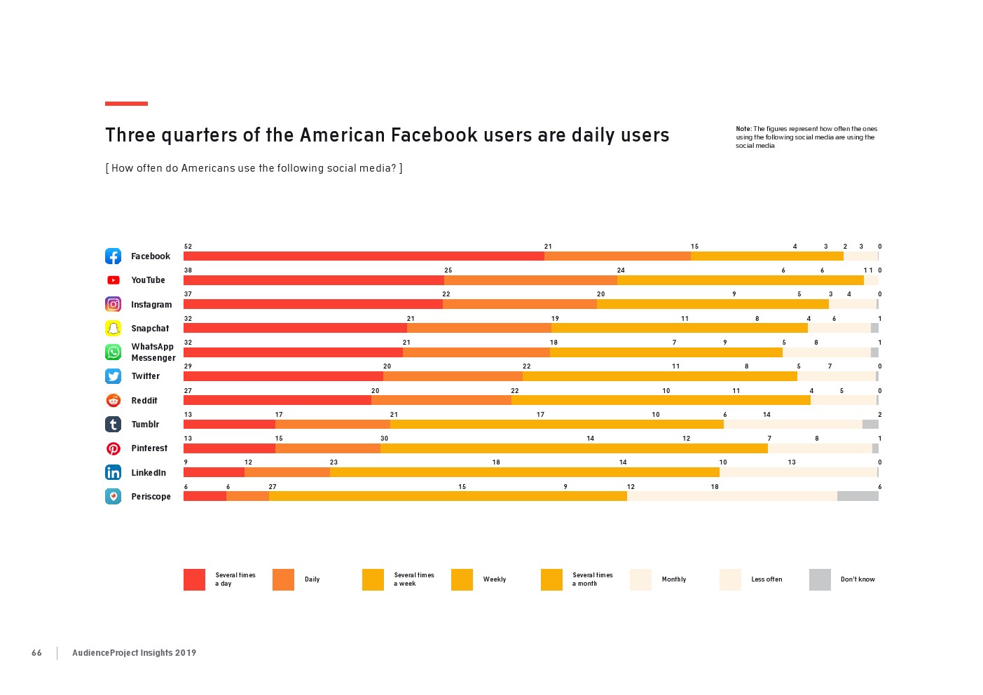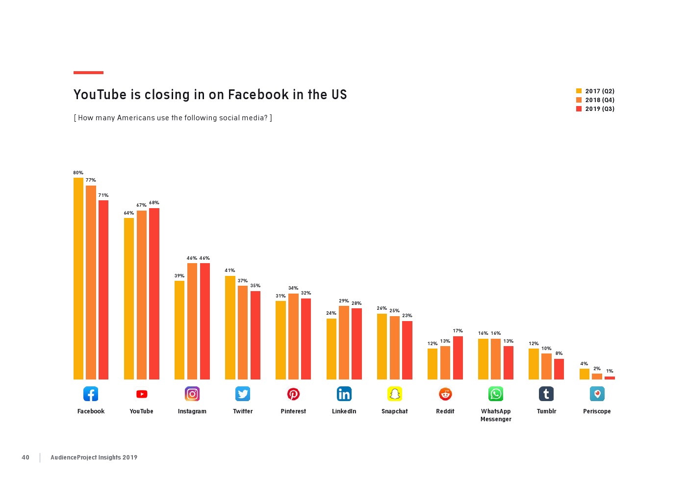 AudienceProject发布了“2019年应用和社交媒体使用报告”。尽管7/10的美国成年人仍在使用Facebook,但它吸引力已经有所下降。AudienceProject对来自美国和欧洲的1.3万名15岁及以上的社交媒体用户的研究表 明,Facebook不再像过去那样不可或缺。