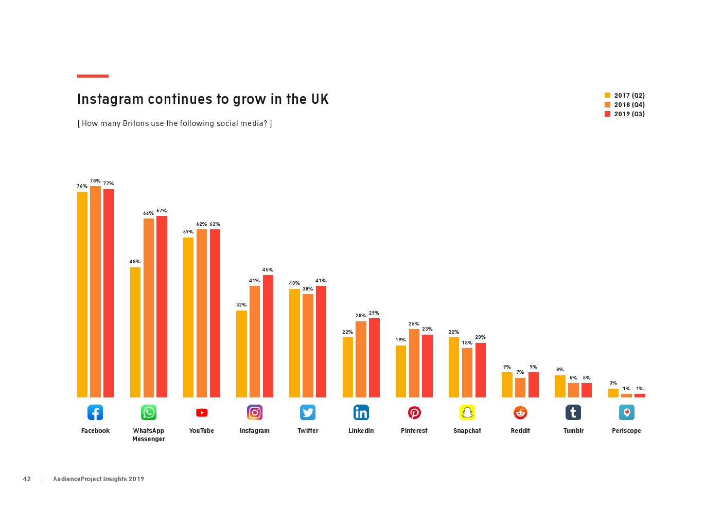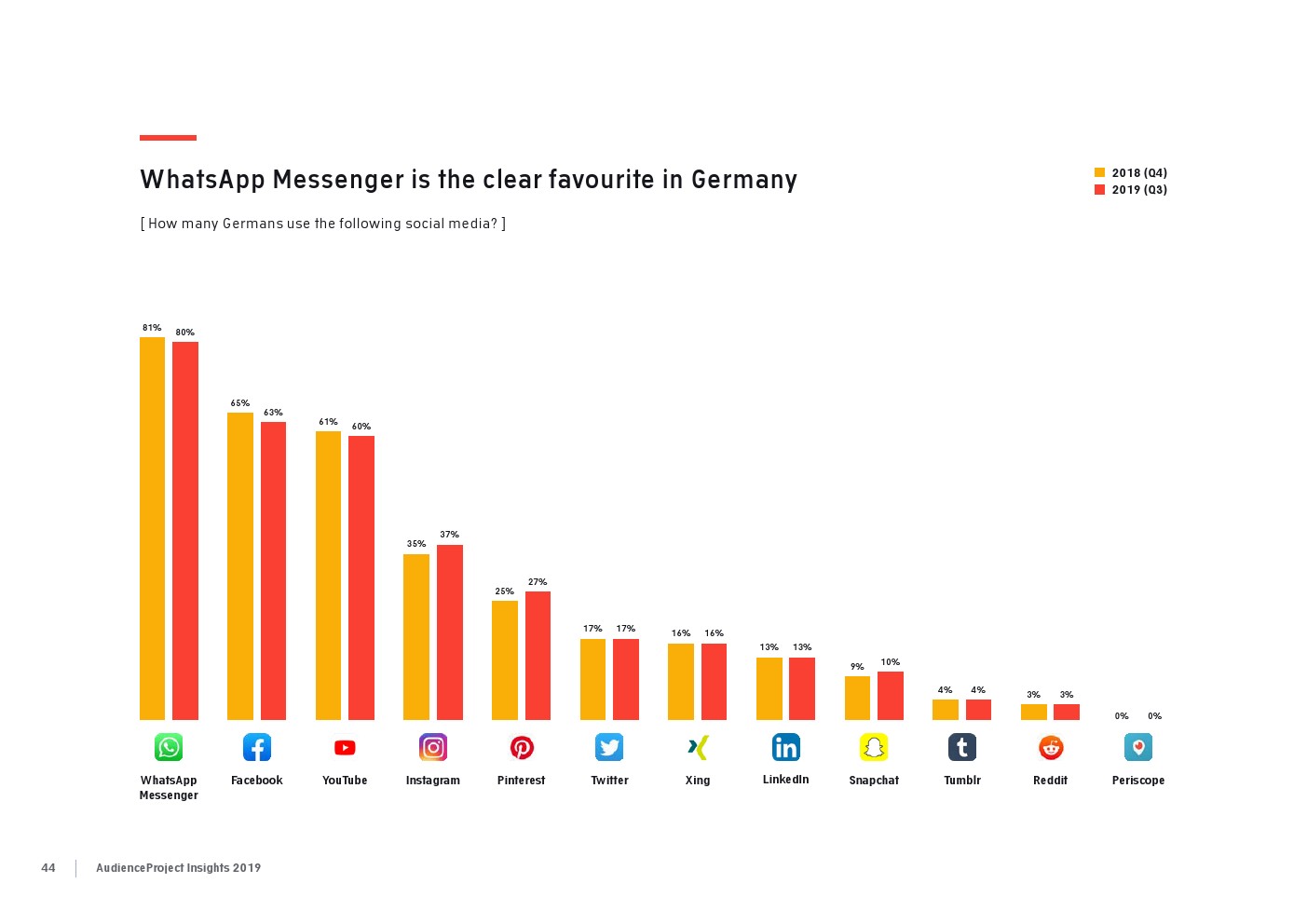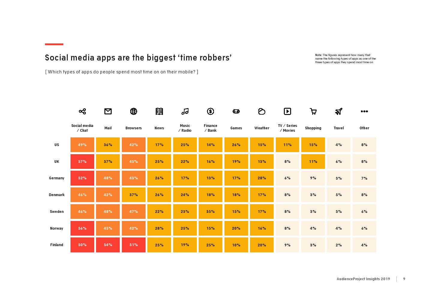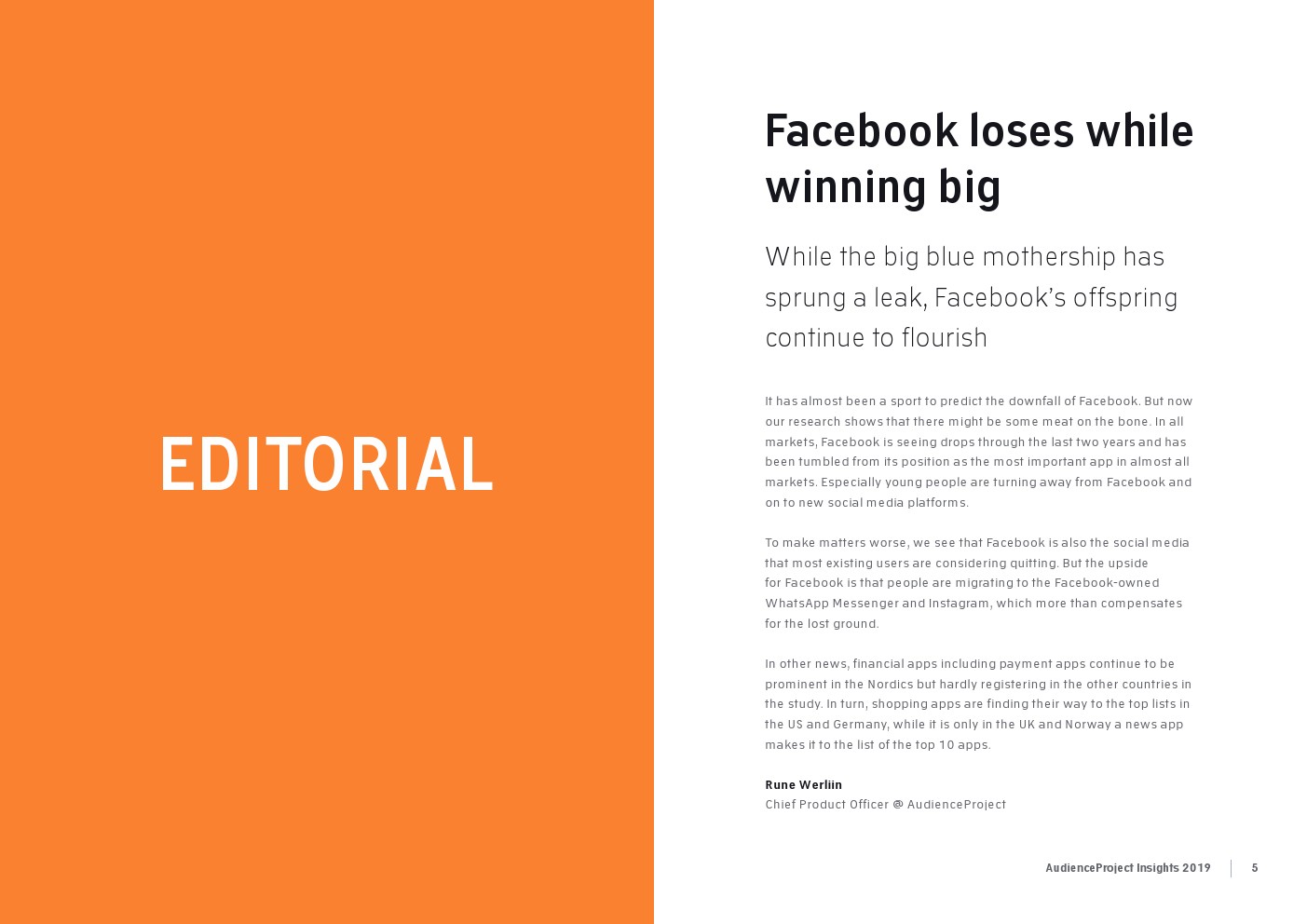 AudienceProject发布了“2019年应用和社交媒体使用报告”。尽管7/10的美国成年人仍在使用Facebook,但它吸引力已经有所下降。AudienceProject对来自美国和欧洲的1.3万名15岁及以上的社交媒体用户的研究表 明,Facebook不再像过去那样不可或缺。
