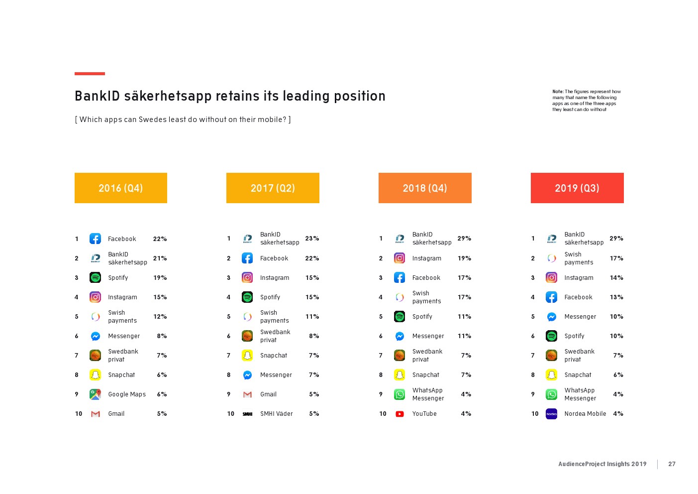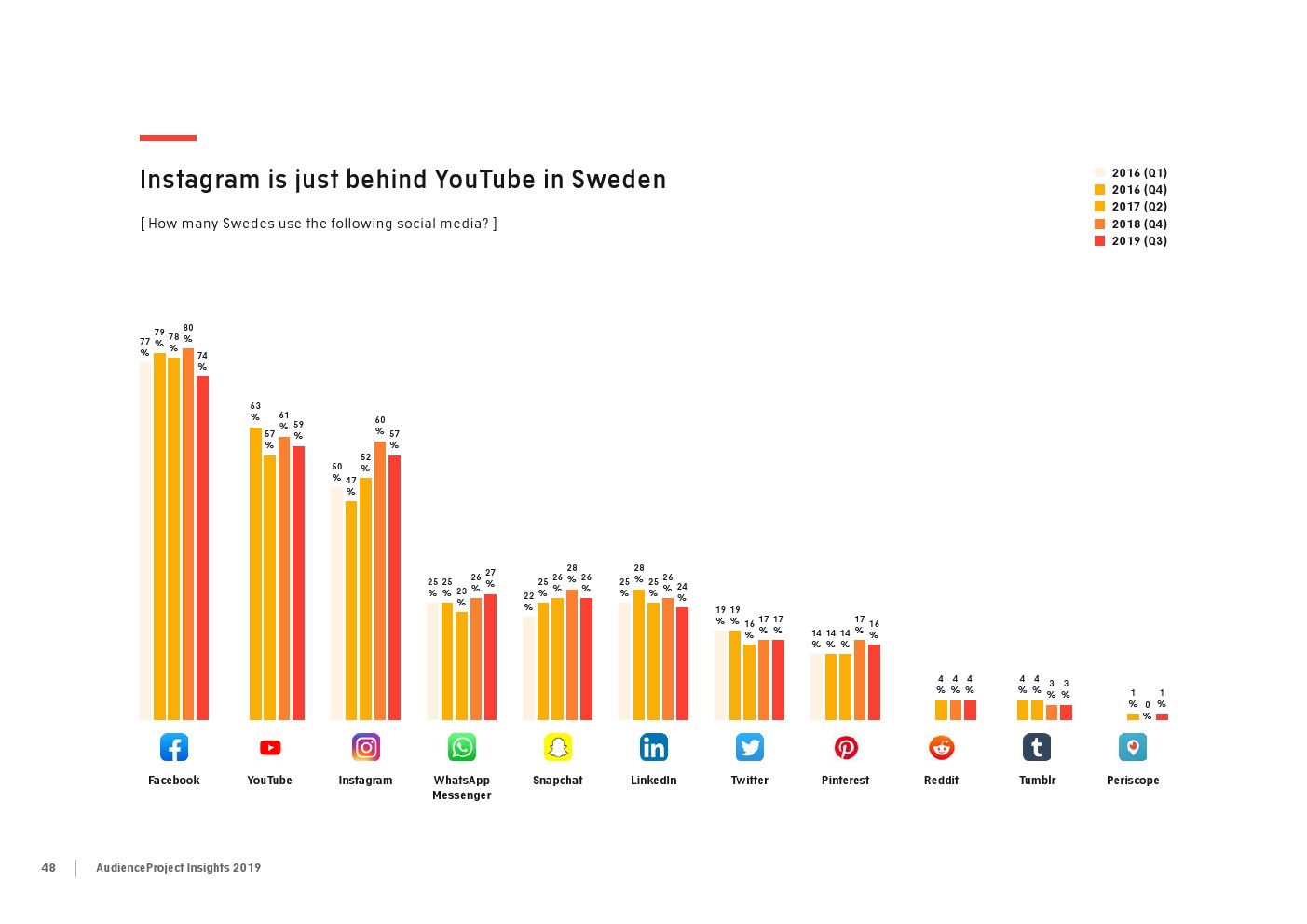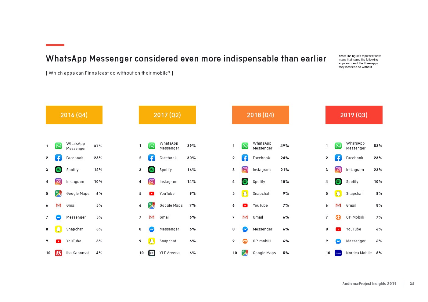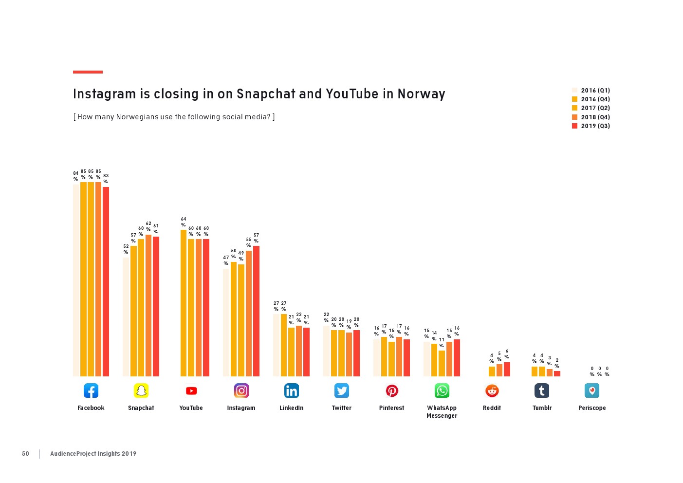 AudienceProject发布了“2019年应用和社交媒体使用报告”。尽管7/10的美国成年人仍在使用Facebook,但它吸引力已经有所下降。AudienceProject对来自美国和欧洲的1.3万名15岁及以上的社交媒体用户的研究表 明,Facebook不再像过去那样不可或缺。
