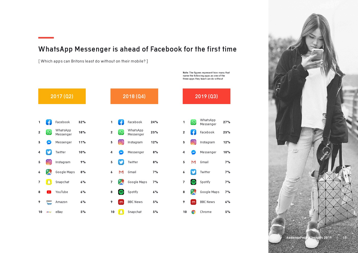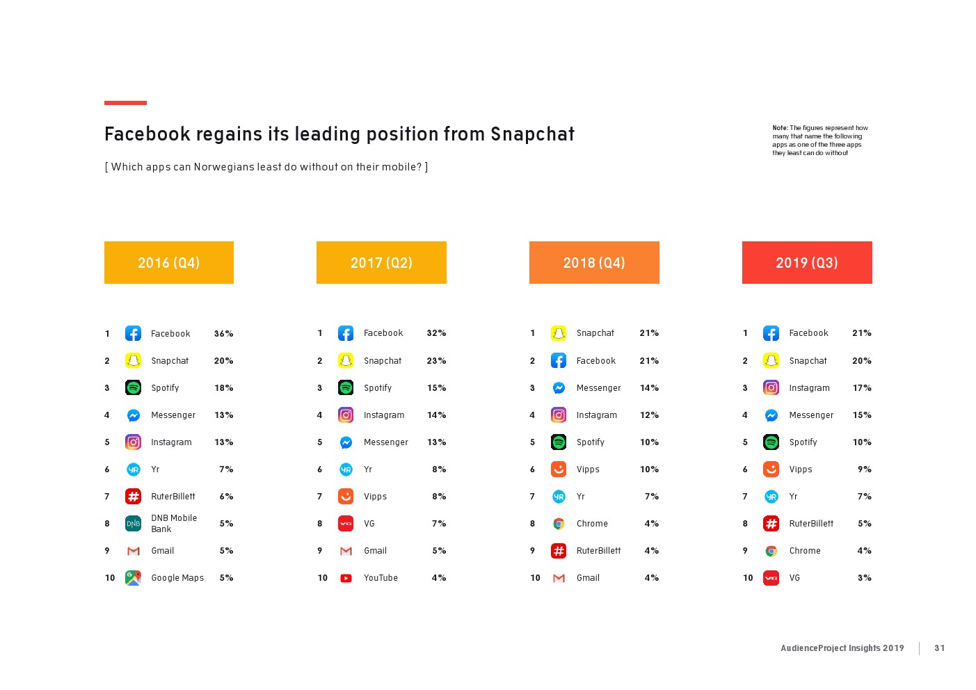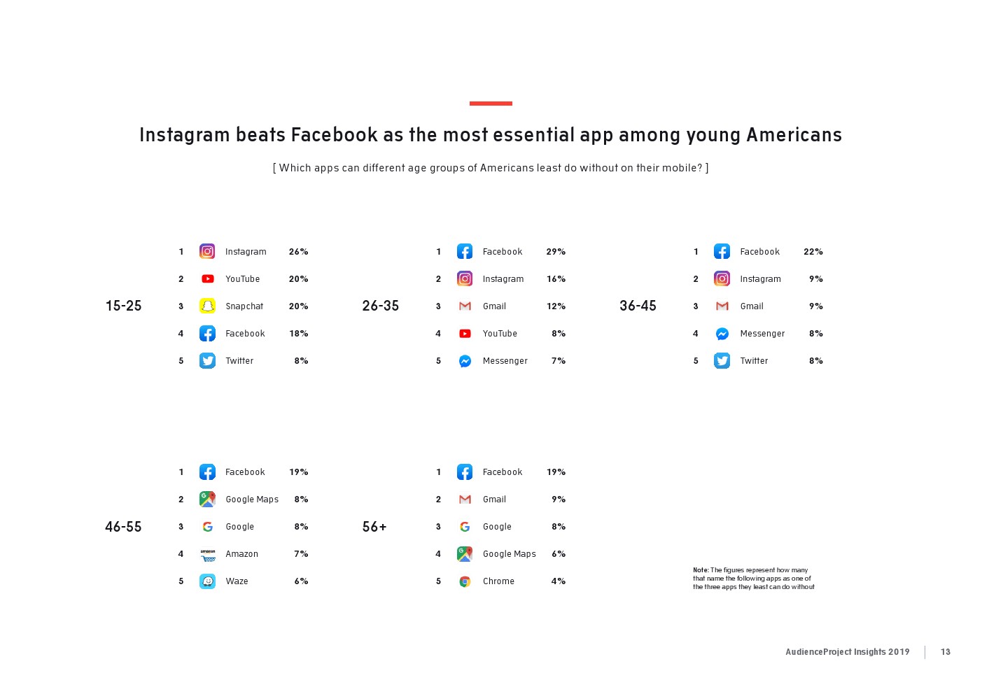 2017年,26%的美国受访者表示,Facebook是他们最不可或缺的三个应用之一。两年后,这一比例则下降到21%。其他国家的偏好度下降幅度更大。来自挪威的21%的受访者认为Facebook是今年最受欢迎的3款应用之一,而两年前有32%的受访者这样认为。同样,在英国,Facebook的重要性从2017年的32%下降到2019年的23%。去年,皮尤的一项报告显示,美国18-29岁的Facebook用户中有47%在几周或更长时间内离开了Facebook。AudienceProject的数据还发现,在较年轻的年龄组(18-25岁之间),Facebook的重要性更低。这些年轻的社交媒体用户中只有大约1/5认为Facebook是他们最不能缺少的社交媒体平台。尤其是对于美国青少年来说,Facebook在他们最喜欢的社交媒体平台上输给了Snapchat、Instagram和Twitter。最近的一项研究还发现,只有31%的美国青少年在使用Facebook,而使用Instagram(85%)和Snapchat(81%)的人数比Facebook要高得多。