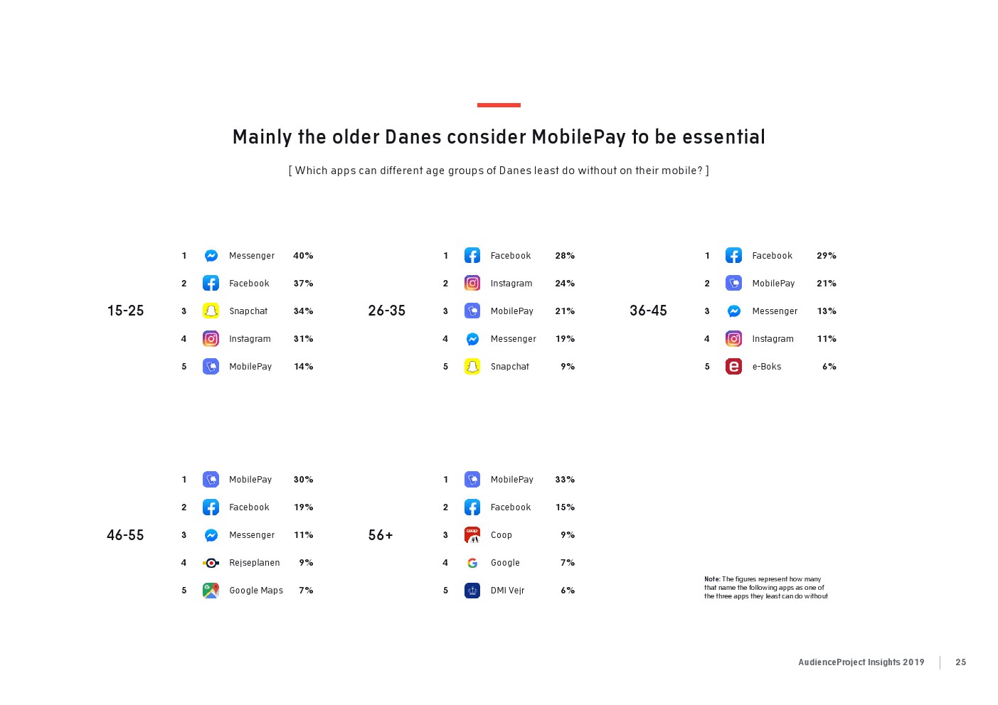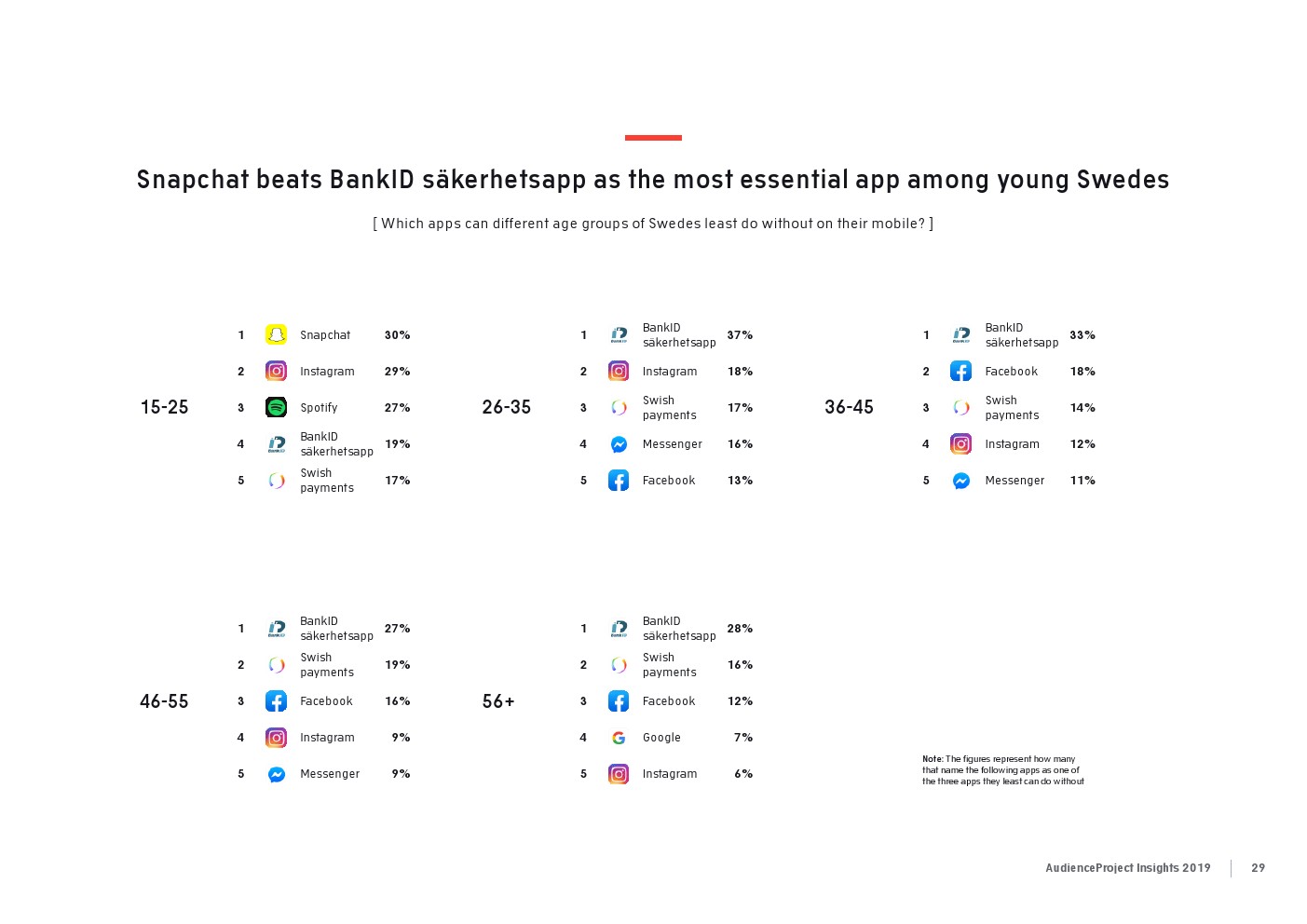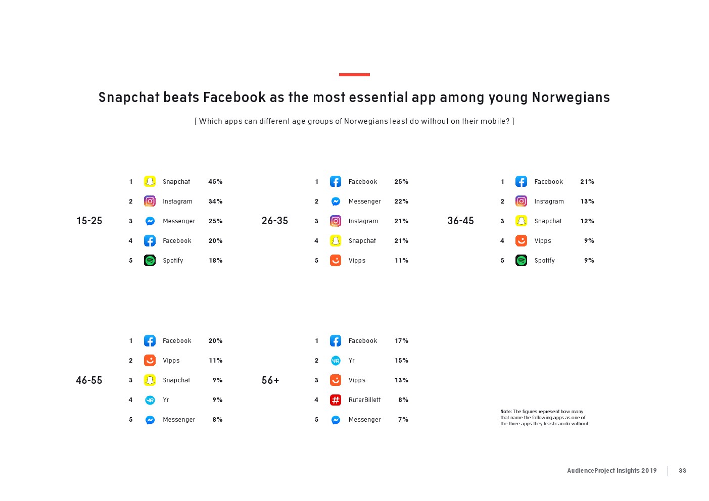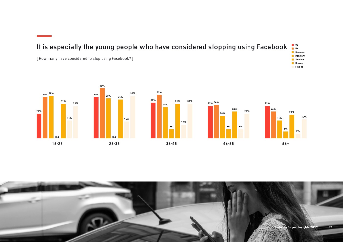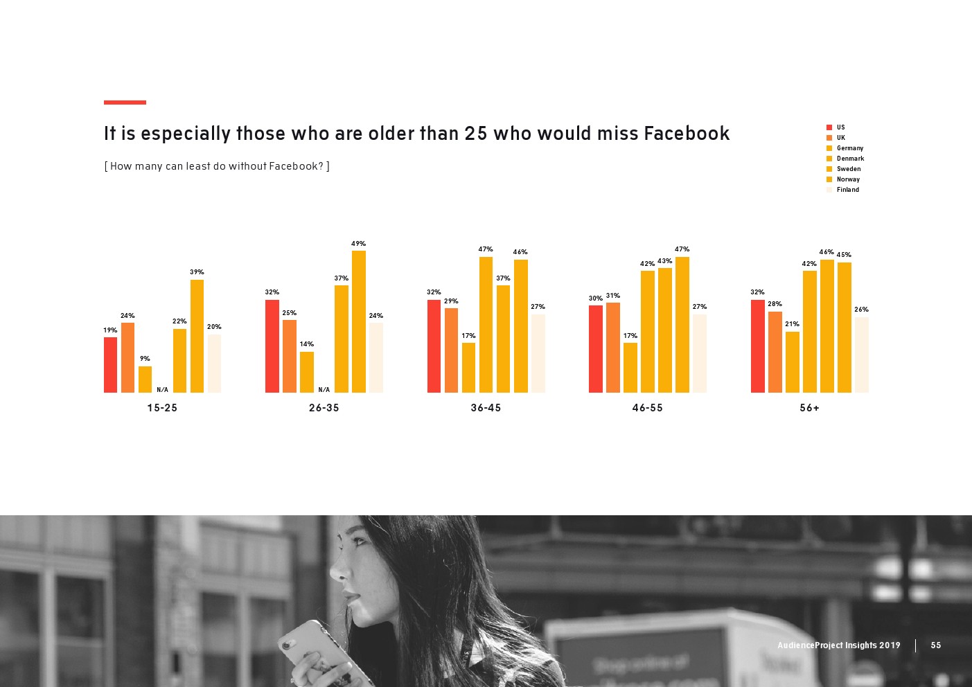 相比之下,老一辈人对Facebook的依恋程度更高一些。在接受AudienceProject调查的46-55岁的人中有3/10不能没有Facebook,而其他三个年龄组(26-35岁,36-45岁和56岁以上的人)中只有约1/3受访者(32%)表示,Facebook是他们无法离开的社交媒体平台。