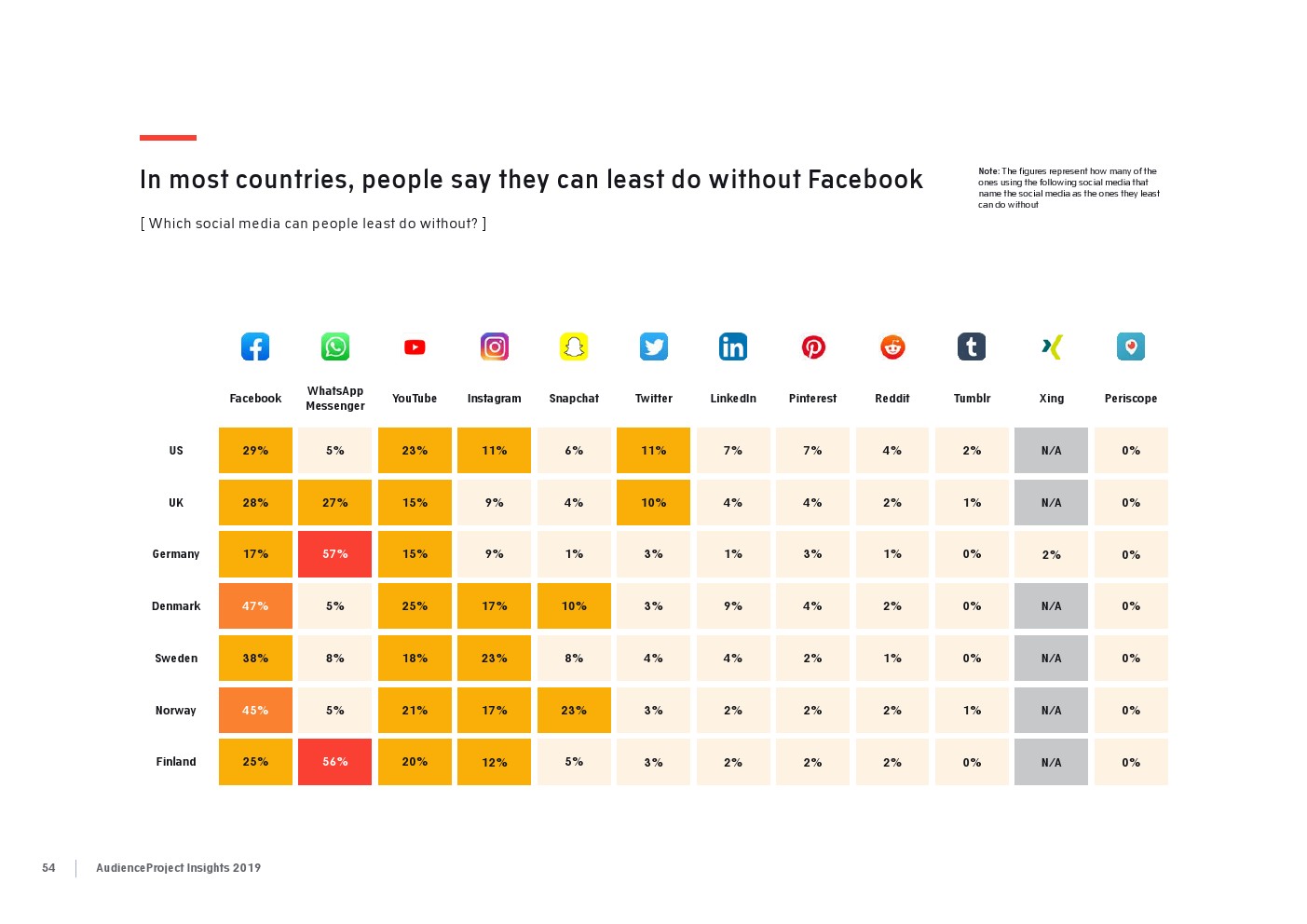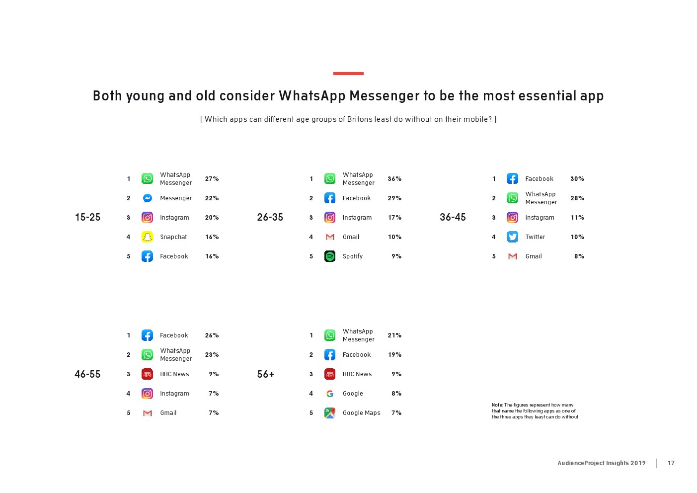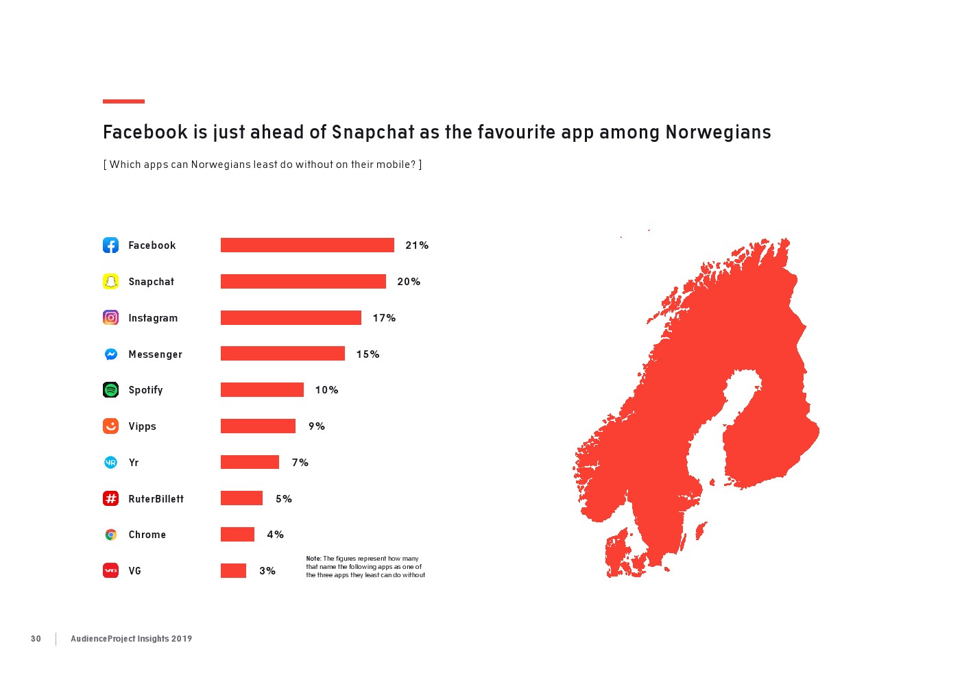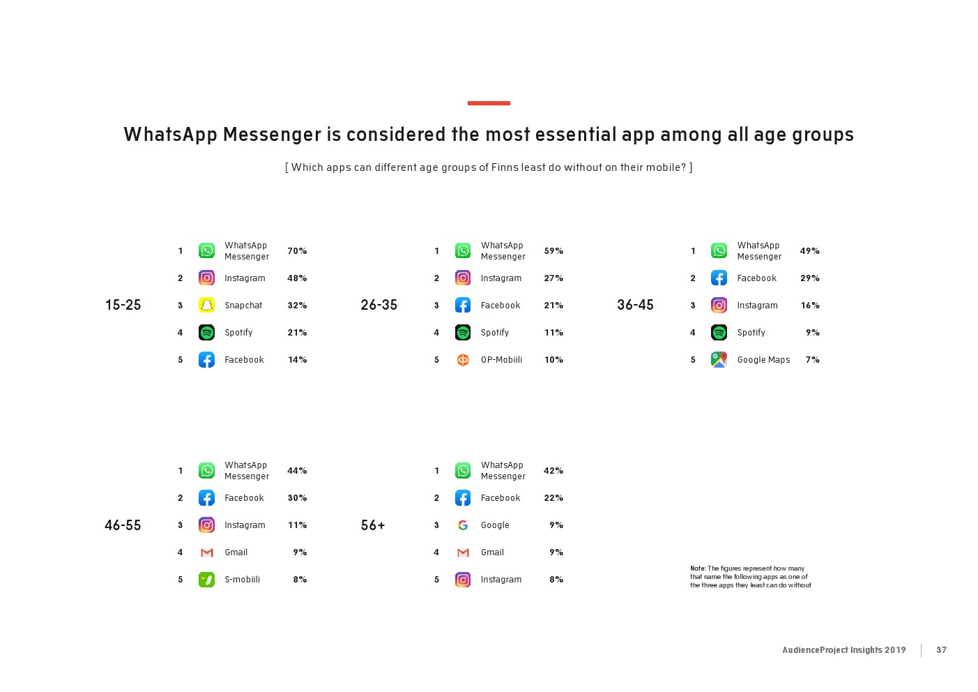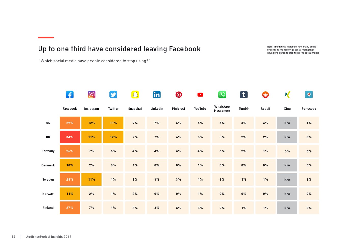 相比之下,老一辈人对Facebook的依恋程度更高一些。在接受AudienceProject调查的46-55岁的人中有3/10不能没有Facebook,而其他三个年龄组(26-35岁,36-45岁和56岁以上的人)中只有约1/3受访者(32%)表示,Facebook是他们无法离开的社交媒体平台。