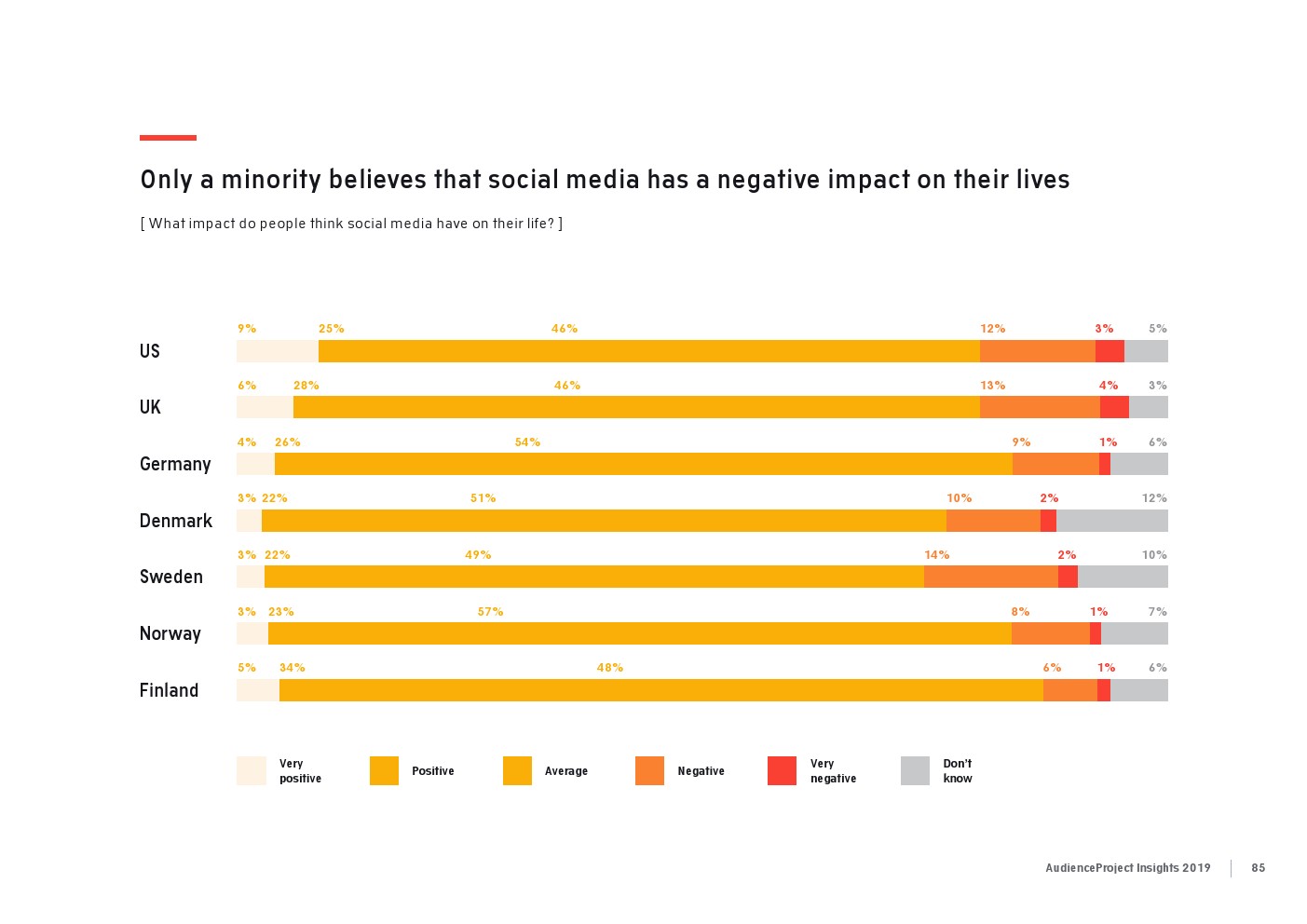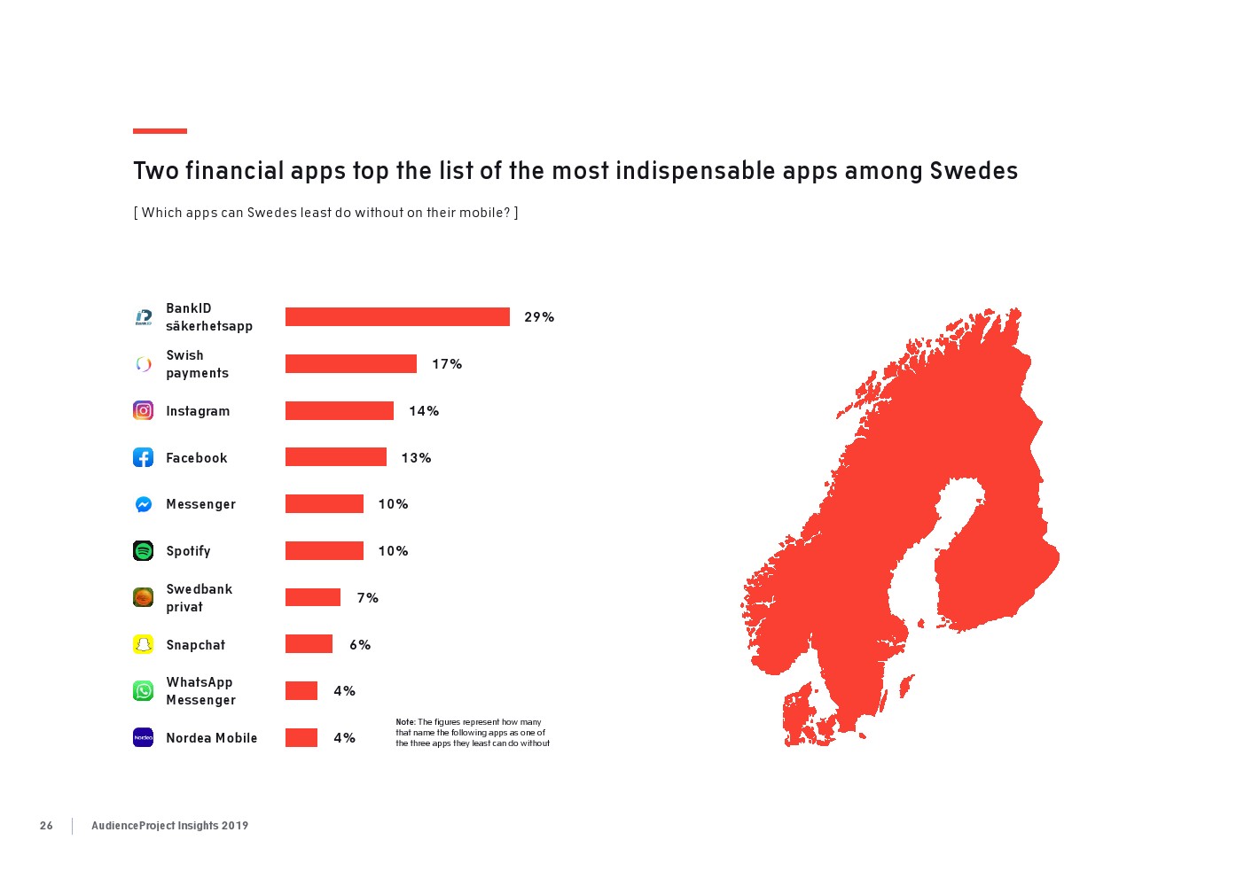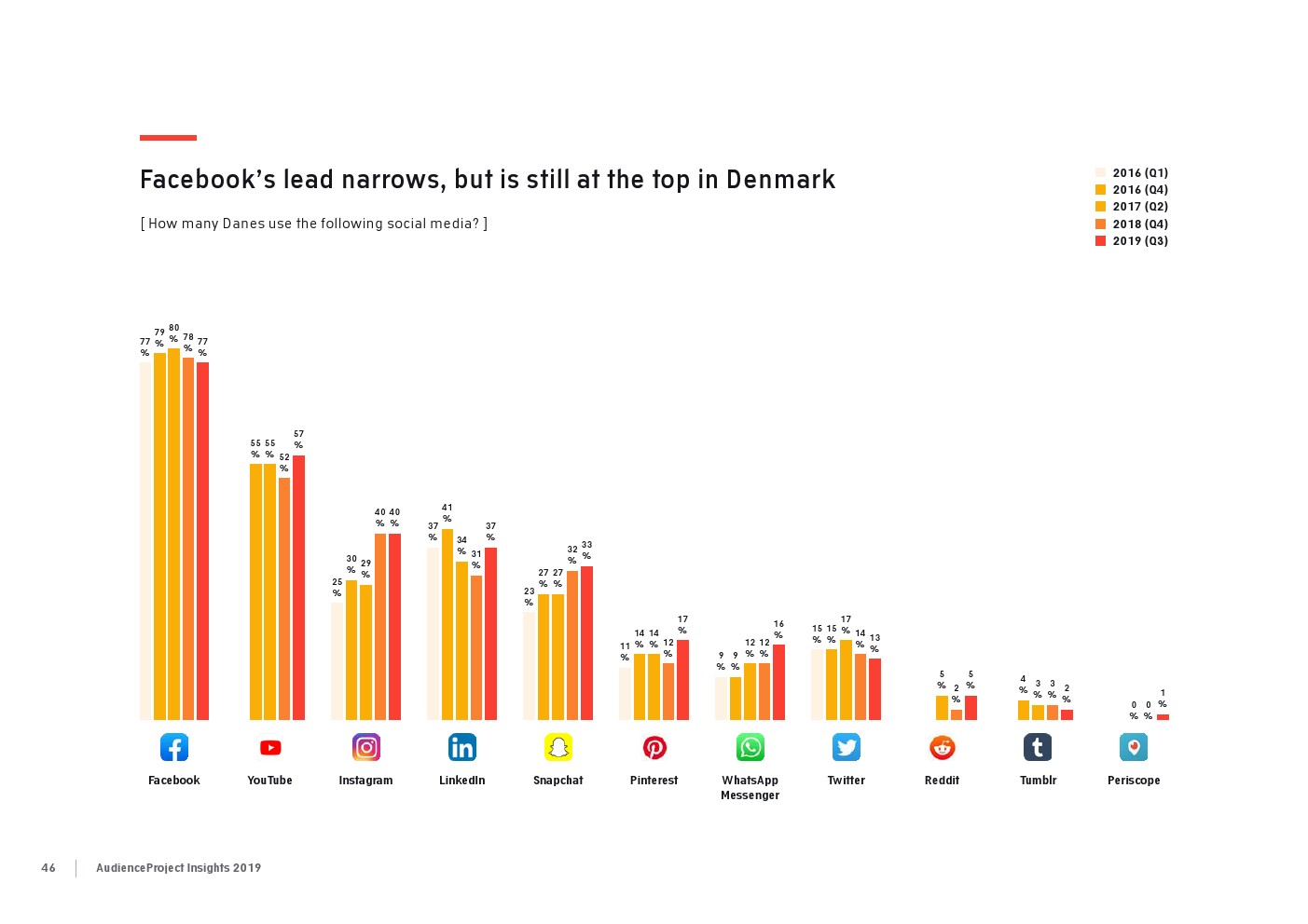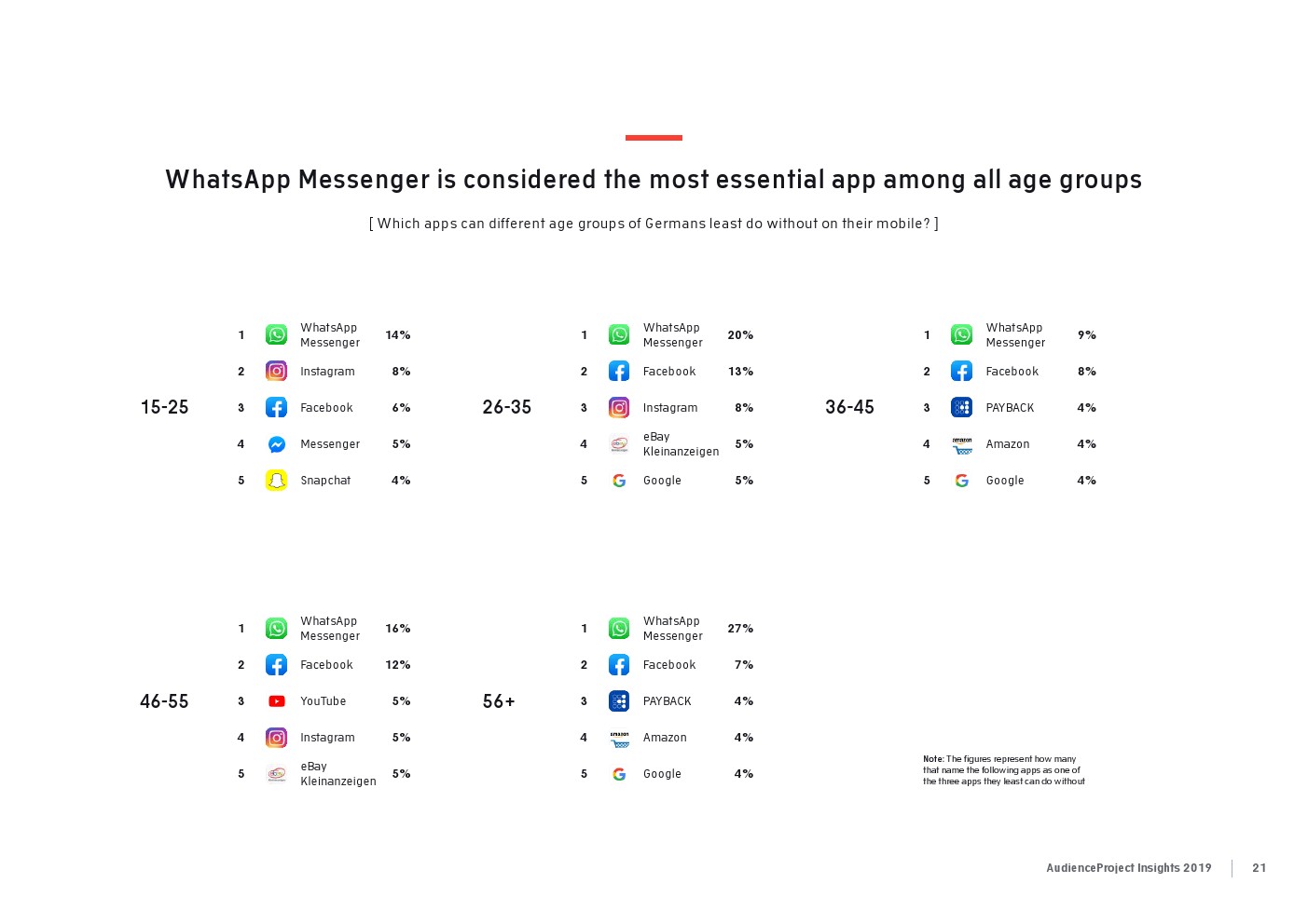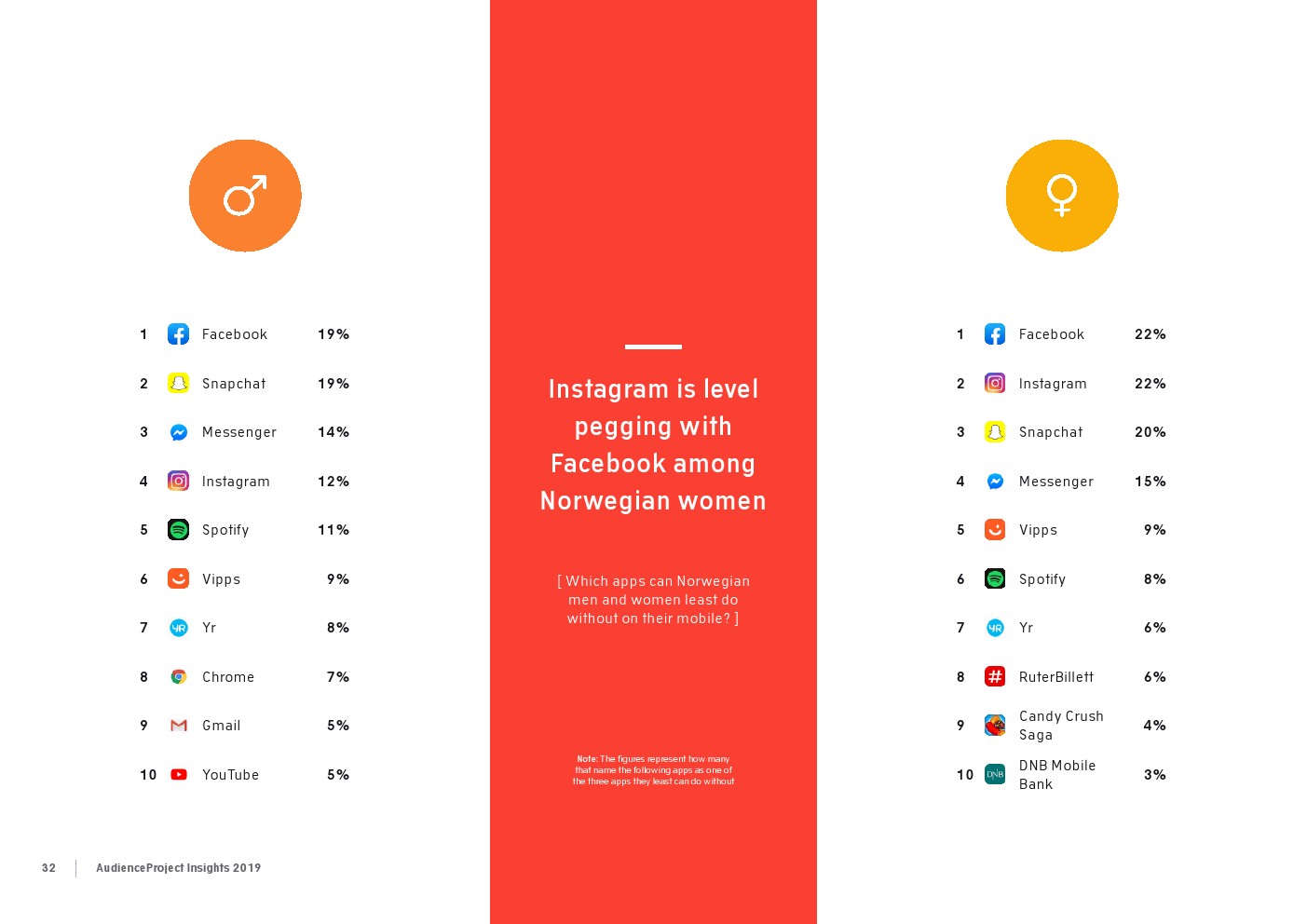 相比之下,老一辈人对Facebook的依恋程度更高一些。在接受AudienceProject调查的46-55岁的人中有3/10不能没有Facebook,而其他三个年龄组(26-35岁,36-45岁和56岁以上的人)中只有约1/3受访者(32%)表示,Facebook是他们无法离开的社交媒体平台。