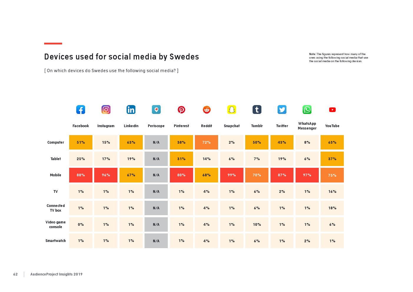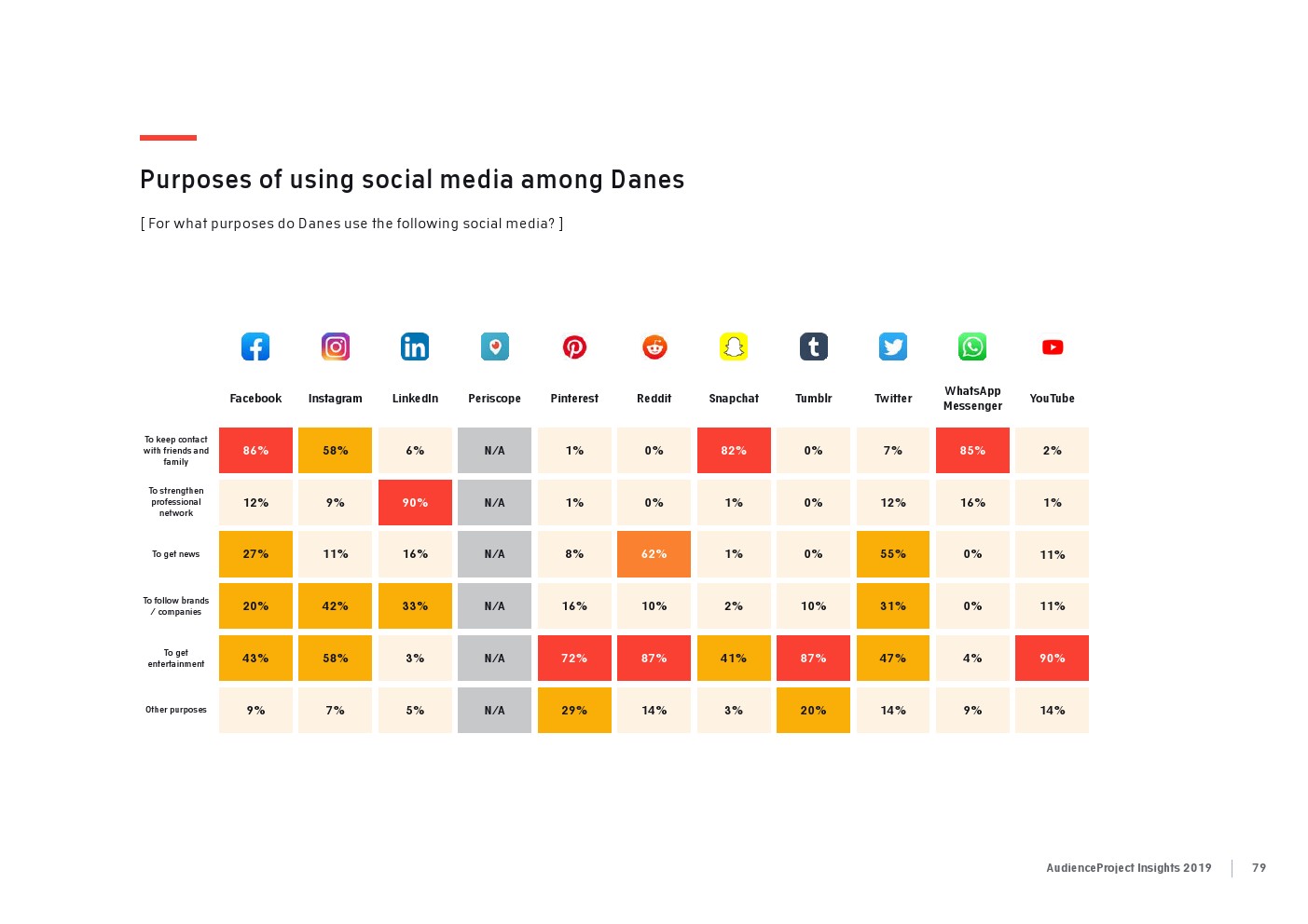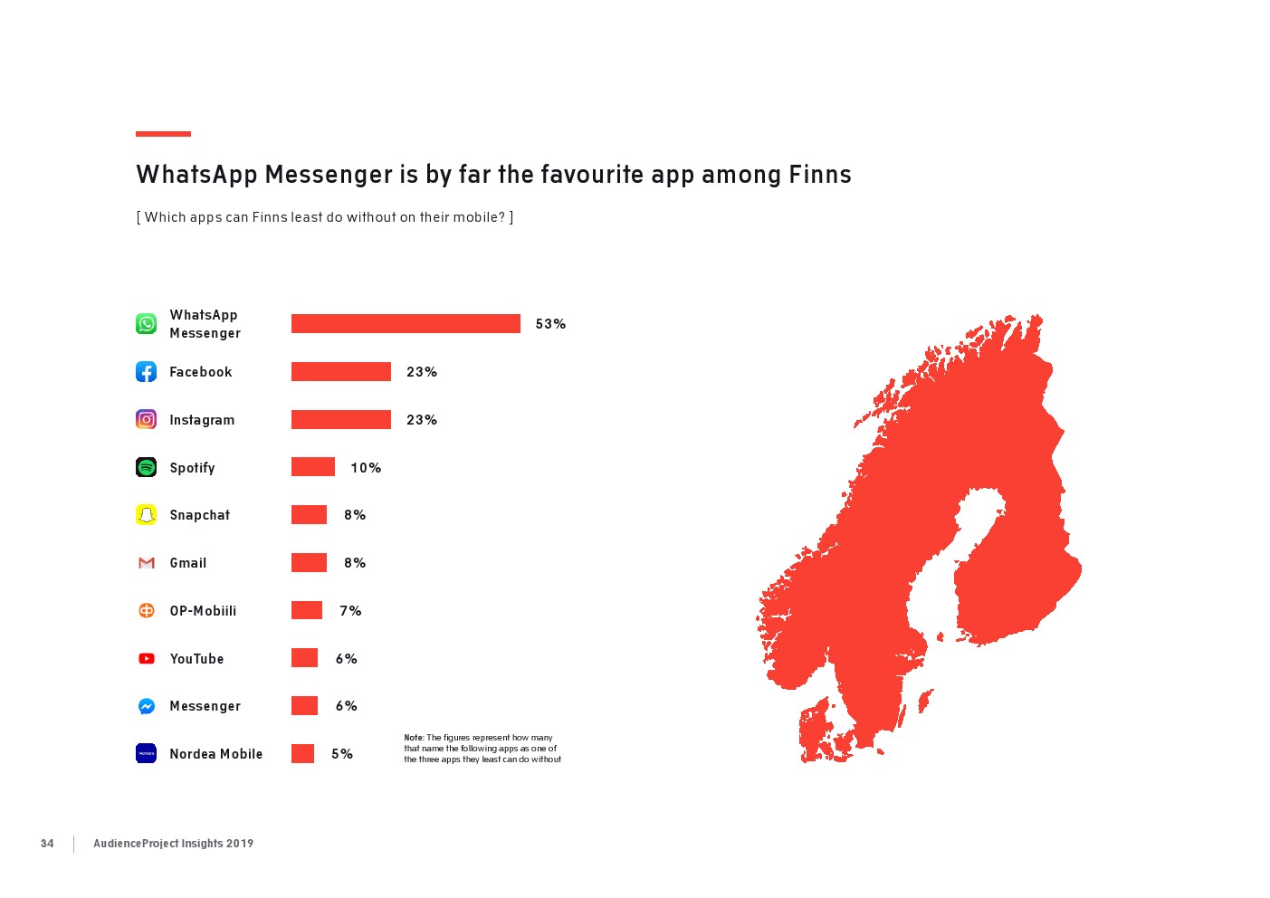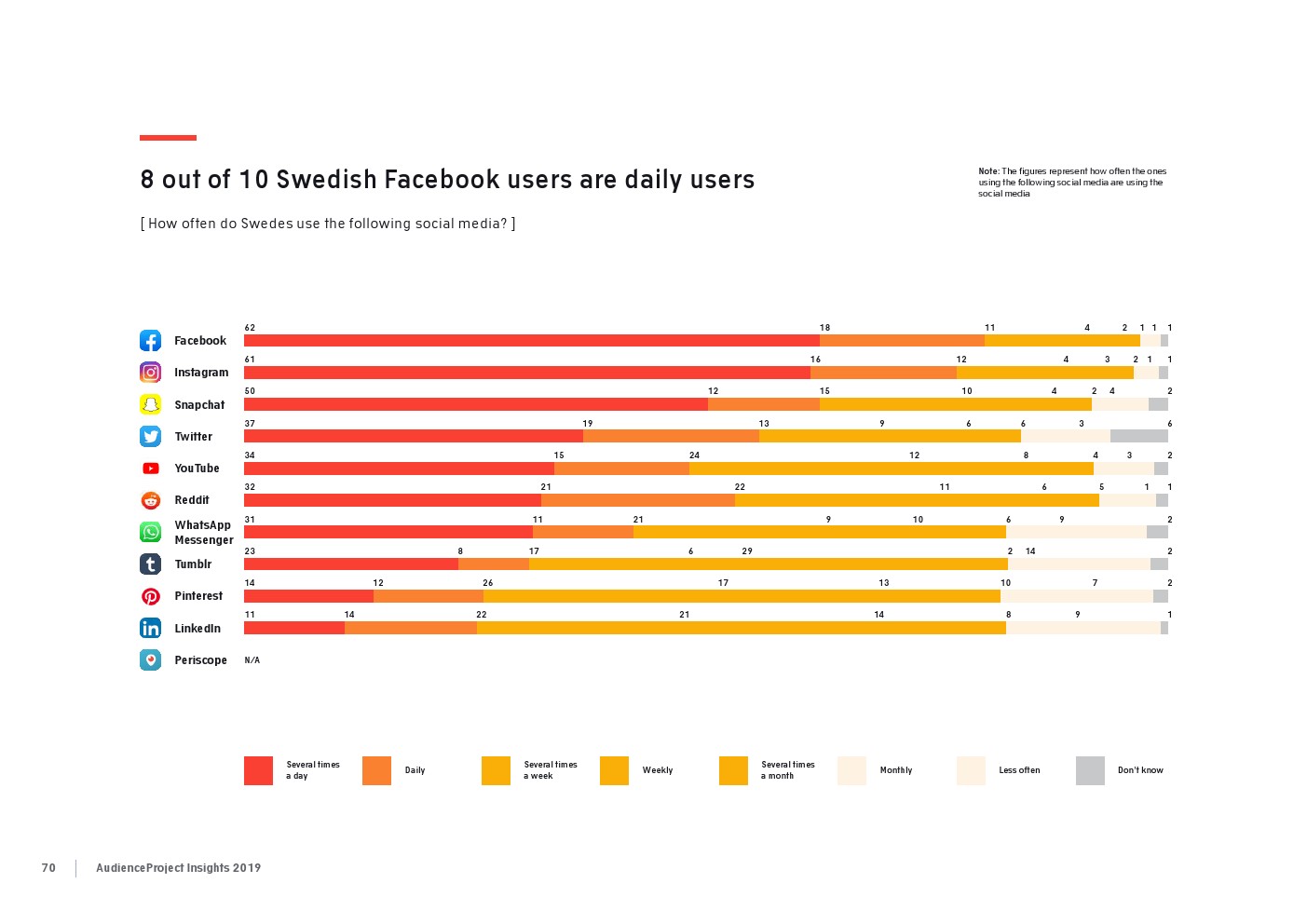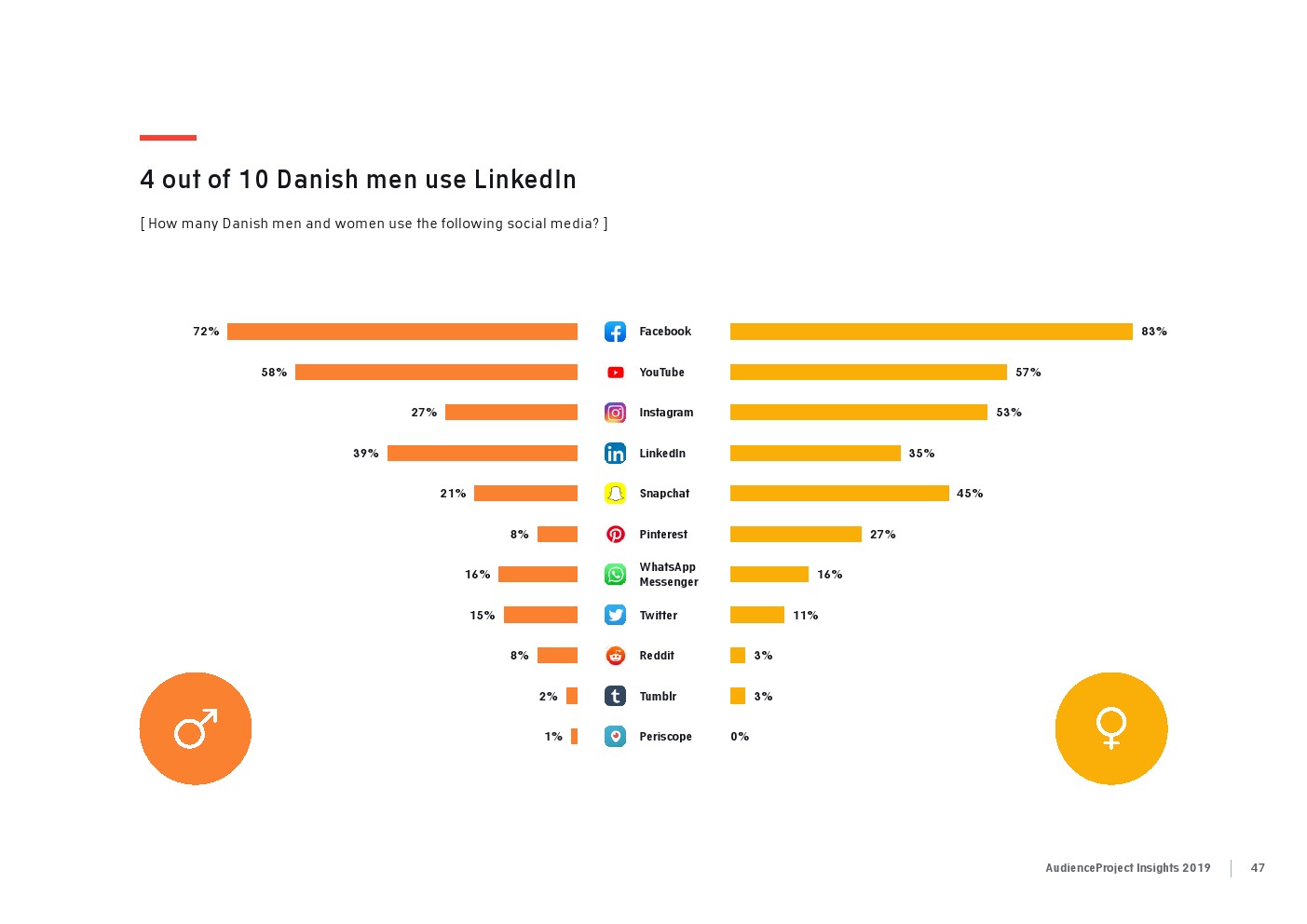相比之下,老一辈人对Facebook的依恋程度更高一些。在接受AudienceProject调查的46-55岁的人中有3/10不能没有Facebook,而其他三个年龄组(26-35岁,36-45岁和56岁以上的人)中只有约1/3受访者(32%)表示,Facebook是他们无法离开的社交媒体平台。