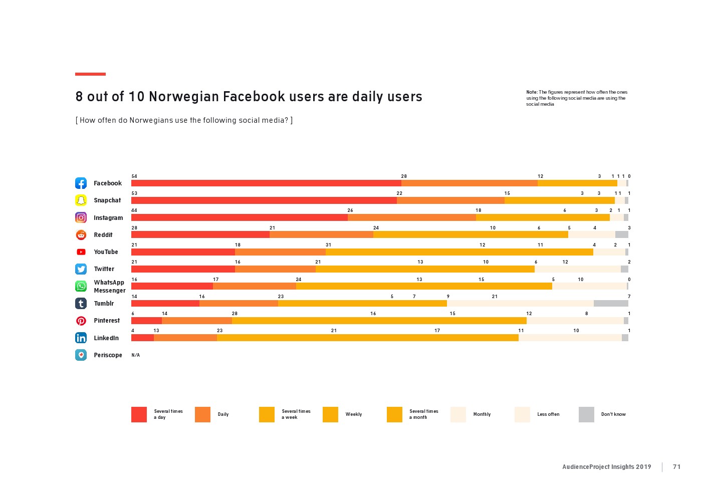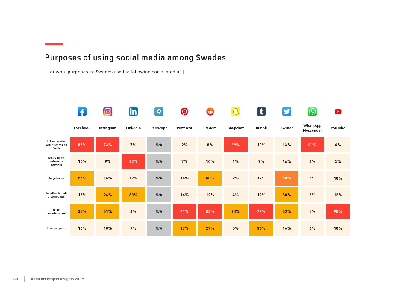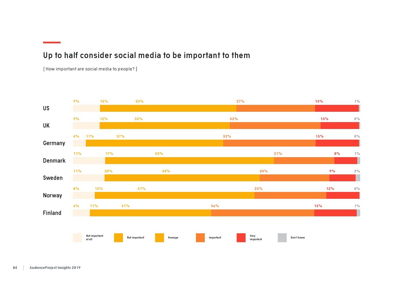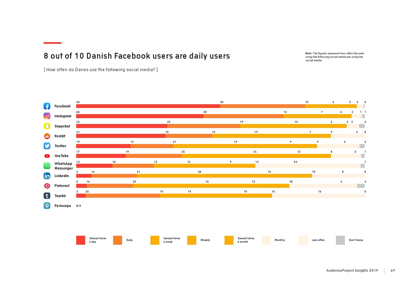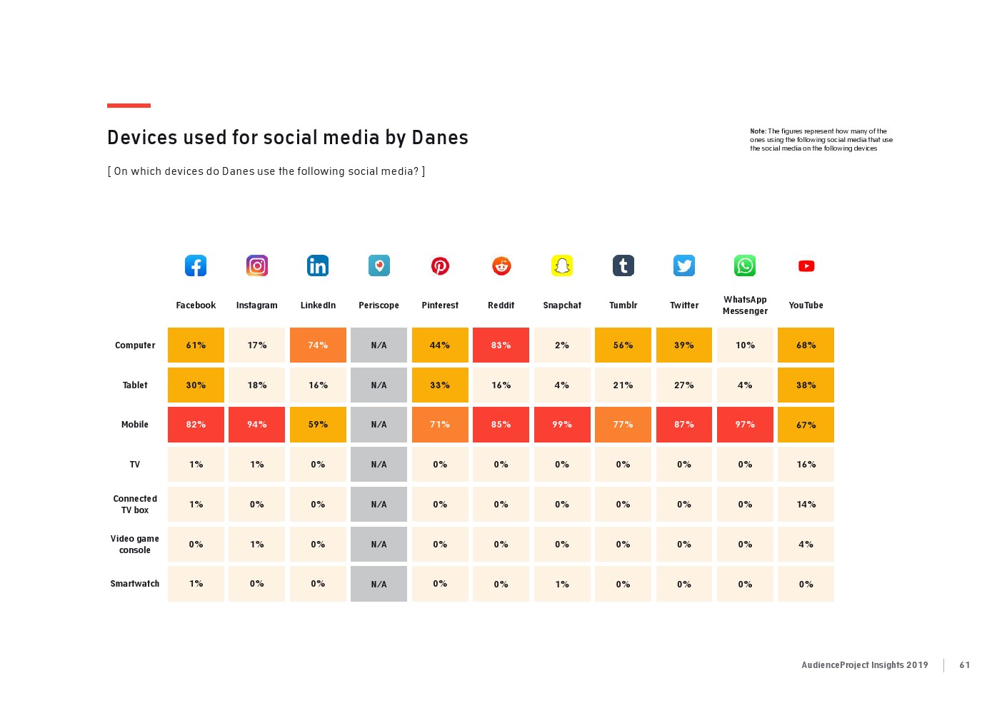 相比之下,老一辈人对Facebook的依恋程度更高一些。在接受AudienceProject调查的46-55岁的人中有3/10不能没有Facebook,而其他三个年龄组(26-35岁,36-45岁和56岁以上的人)中只有约1/3受访者(32%)表示,Facebook是他们无法离开的社交媒体平台。
