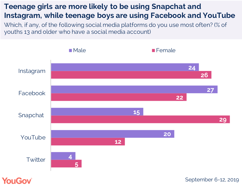 在年轻女性中,Snapchat(29%)是最常用的平台。对于男性青少年来说, Facebook(27%)是最常用的平台。