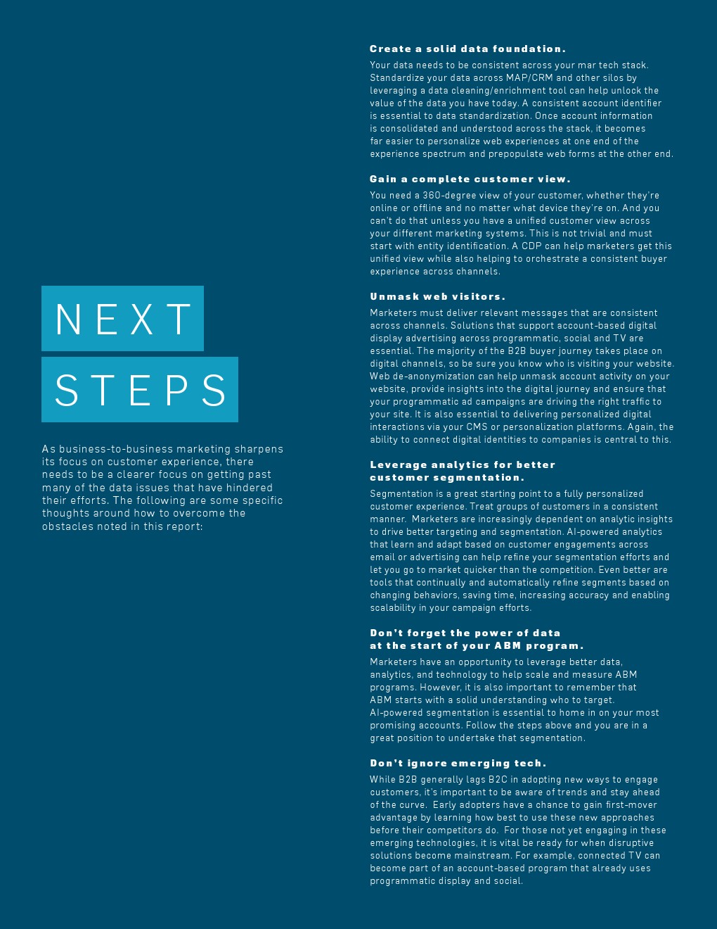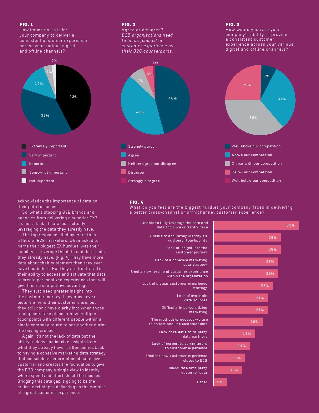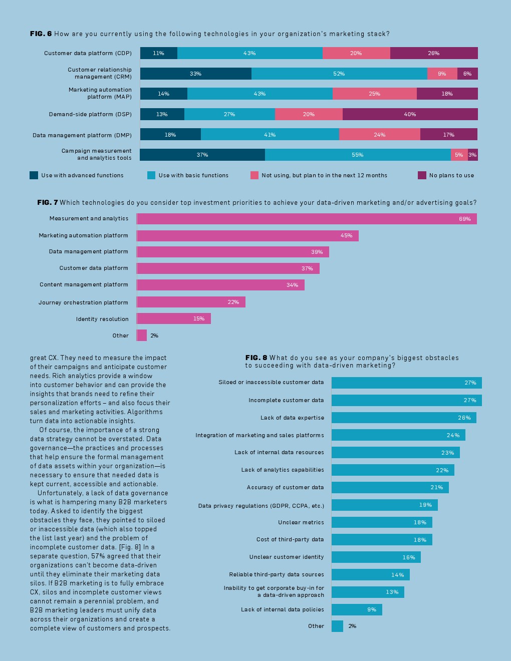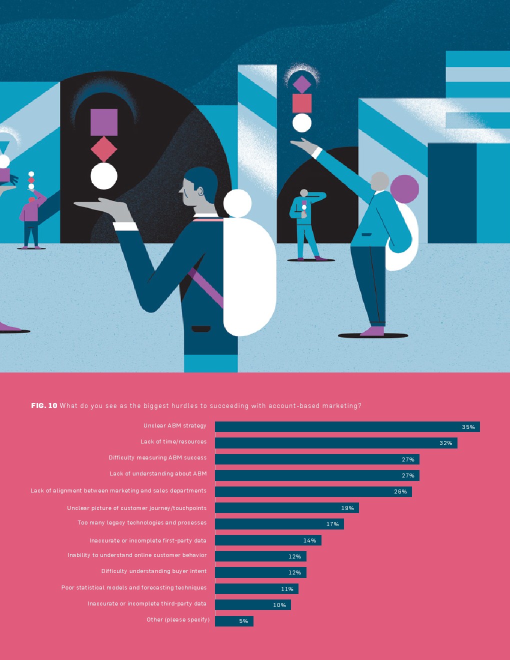 对于B2B营销人员来说,无法充分利用数据和目前拥有的数据工具是跨渠道提供更好的客户体验的最大障碍之一(33%)。此外,由于缺乏有凝聚力的营销数据策略(25%)和可用的数据源(21%)也导致企业难以提供一致的跨渠道体验。