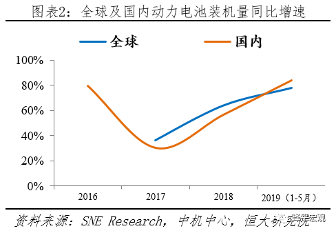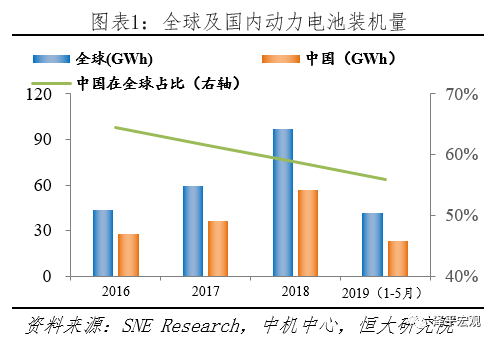 受益新能源汽车产销规模扩大及单车带电量提升,动力电池市场保持高速增长。据中机中心合格证数据统计,2009-2018年期间,我国动力电池装机量从0.028GWh增加到57.04GWh,十年增长超千倍,年复合增速达233.17%。据SNE Research和中机中心统计,2019年1-5月全球市场动力电池装机量为41.76GWh,同比增长78.00%;国内市场动力电池装机量为23.37GWh,同比增长83.94%。