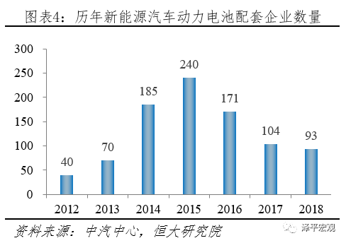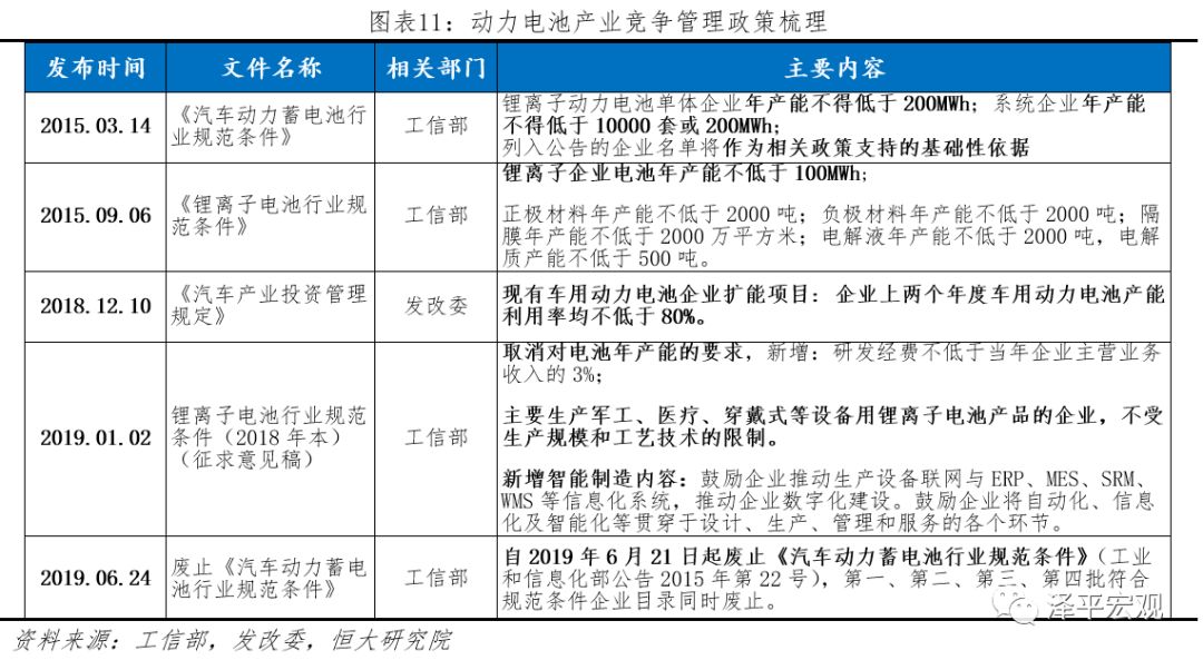 1)第一阶段为扶持企业做大。2015年5月工信部发布《汽车动力蓄电池行业规范条件》要求,动力电池单体企业年产能不得低于2亿Wh;2015年9月发布的《锂离子电池行业规范条件》,进一步细分到正极、负极、隔膜、电解液等四大原材料产能。此外,明确列入公告名单的企业将作为相关政策支持的基础性依据。2015年11月至2016年6月之间先后发布4批符合条件的企业目录(俗称动力电池白名单),共计57家厂商,主要是CATL、天津力神、国轩高科等国内企业。