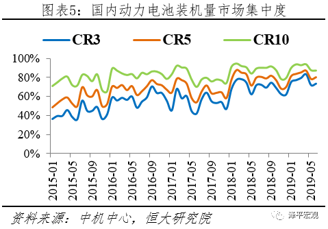 下游新能源汽车由导入期迈入成长期、补贴退坡、技术性能要求提升等因素加剧了电池行业优胜劣汰,市场集中度提升。据中汽中心统计,按照集团口径,2018年我国新能源汽车动力电池配套企业数量只有93家,相比2015年240家减少近2/3。据合格证数据统计,国内动力电池市场CR3、CR5、CR10份额自2015年起持续提升,2019年7月市场CR3、CR5、CR10分别占比84%、89%、94%,相比2015年1月36%、48%、71%分别提升48、41、23个百分点。