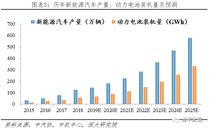 行业仍有很大发展空间。按照2025年新能源汽车产量590万辆测算,动力电池需求量将达到330.6GWh,相比2018年57.07GWh,对应年复合增速为28.52%。