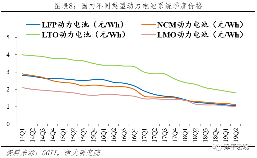 在竞争加剧、补贴退坡、规模效应等因素共同作用下,电池价格快速下降,部分已接近1元/Wh。目前国内动力电池系统按照材料体系划分主要有磷酸铁锂(LFP,正极材料)、三元镍钴锰(NCM,正极材料)、钛酸锂(LTO,负极材料)、锰酸锂(LMO,正极材料)四种。据统计,2014年第一季度LFP、NCM、LTO、LMO动力电池Pack售价分别为2.80、2.90、4.00、2.10元/Wh,截止到2019年第二季度售价分别下降到1.05、1.10、1.80、1.00元/Wh,对应下降幅度62.5%、62.0%、55.0%、52.4%。