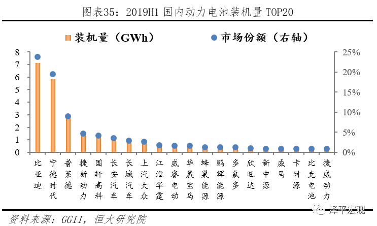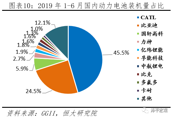 国内市场中本土厂商占据绝大多数市场份额。由于财政补贴、动力电池白名单等限制,外资在国内装机量很低。据GGII统计,2019年上半年国内动力电池装机量TOP10企业分别为CATL、比亚迪、国轩高科、力神、亿纬锂能、中航锂电、比克、多氟多和卡耐,皆为本土厂商,合计占据87.9%的市场份额。