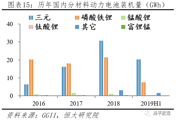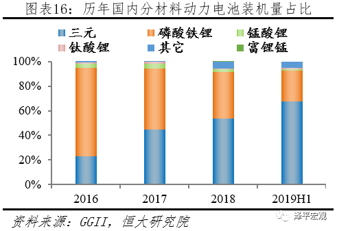 由于动力电池财政补贴能量密度门槛提升及消费者对高续航新能源汽车的青睐,三元材料电池装机量占比持续提升。据GGII披露,2019年上半年三元体系动力电池装机量为20.22GWh,市占率达67.35%,较2016年提升44.46个百分点。