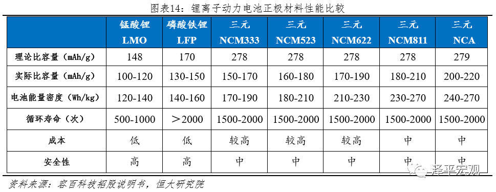 商用锂离子动力电池正极材料主要有锰酸锂、磷酸铁锂、三元体系,其中三元体系又可细分为镍钴锰NCM和镍钴铝NCA。三元材料在能量密度方面有明显优势,已成为应用主流。