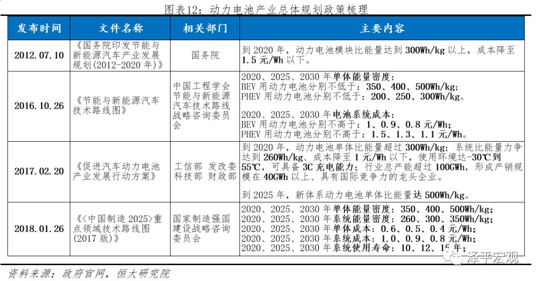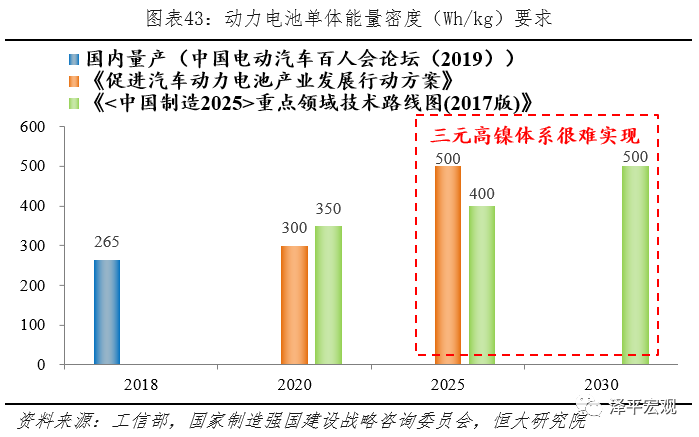为此,政府先后出台多项文件对动力电池能量密度提出规划。2017年2月,工信部联合其他部委发布《促进汽车动力电池产业发展行动方案》指出,到2020、2025年,动力电池单体比能量分别达到300、500Wh/kg;2018年1月,国家制造强国建设战略咨询委员会发布《<中国制造2025>重点领域技术路线图(2017版)》指示,到2020、2025、2030年单体能量密度分别达到350、400、500Wh/kg。2019年1月工信部苗圩部长在“中国电动汽车百人会论坛(2019)”上披露,截止到2018年底我国量产的动力电池单体能量密度已达到265Wh/kg,基本达成2020目标。