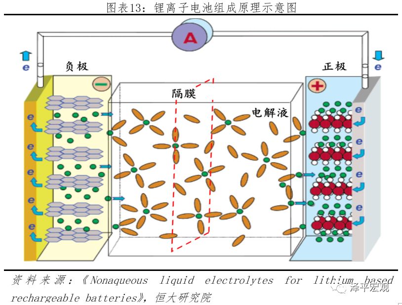 锂离子电池主要由四大原材料组成,分别是:正极、负极、隔膜、电解液。如图所示,充电时Li+从正极脱出,进入电解液中,嵌入负极,其中隔膜起着导通离子,阻隔电子的作用;反之放电时Li+从负极脱出,经电解液嵌入正极。