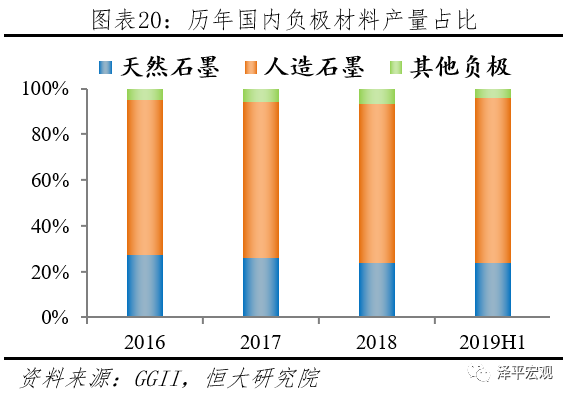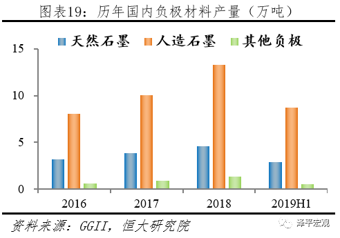 当前负极材料应用以人造石墨为主、天然石墨为辅。据GGII统计,2019上半年我国人造石墨、天然石墨、其他负极产量分别为87500、28800、5000吨,对应占比72.14%、23.74%、4.12%,人造石墨占比超过7成。从趋势上看,人造石墨市场占比缓慢提升,从2016年到2019H1增加4.29个百分点。