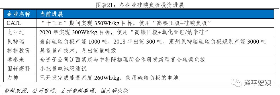碳负极有望成为下一代负极材料。商用化石墨负极实际容量已接近理论值372mAh/g,提升空间有限,急需寻找新的替代材料。Si单质由于充电过程中体积膨胀大(接近300%,石墨10%),首次充电效率低、材料加工成本高、导电率差等缺点,无法单独作为负极,但是其超高的理论容量(4200mAh/g)可成为理想的添加剂,碳负极中加入少量Si(5-10%)可显著提升容量,硅碳负极有望成为下一代负极材料,各企业纷纷布局。国外松下硅碳负极技术领先,在2013年即实现量产(NCR18650),特斯拉Model 3用动力电池即采用硅碳负极。