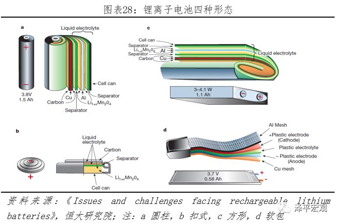 锂离子电池按照封装形态可分为圆柱、扣式、方形、软包四种,其中扣式基本只在实验室测试使用。