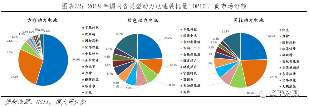 从市场集中度来看,方形最高、圆柱次之、软包最低。据GGII统计2018年国内各形态动力电池市场集中度,方形动力电池最高,基本被CATL和比亚迪两家垄断,合计占比82.0%;圆柱动力电池次之,比克、力神领先优势明显,合计占比46.5%;软包动力电池市场集中度最低,孚能科技、卡耐等市场份额相对较高,总体各企业间市占率差别较小。