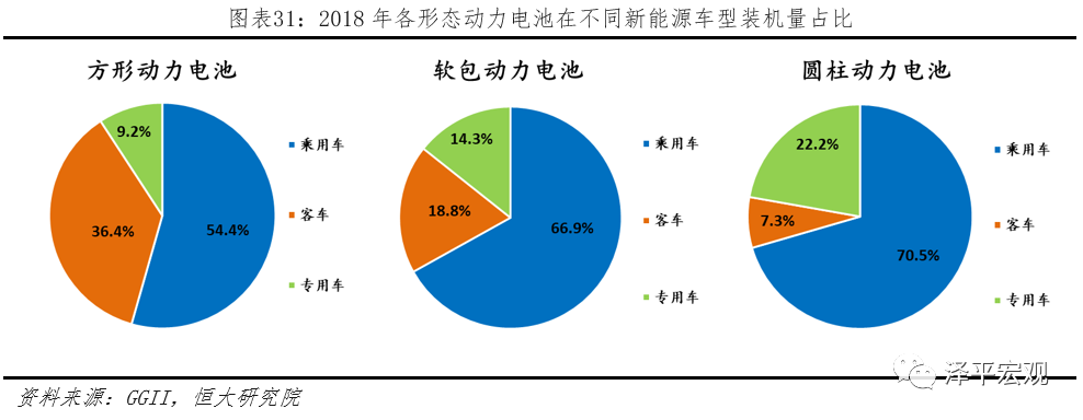 方形、软包、圆柱在不同车型上占比差异较大。据GGII统计2018年三种形态动力电池在乘用车、客车、专用车的装机量占比,其中方形分别为54.4%、36.4%、9.2%,圆柱为70.5%、7.3%、22.2%,软包为66.9%、18.8%、14.3%。对比发现:1)方形动力电池在专用车上的占比较低,主要是由于方形电池龙头CATL的客户基本都是乘用车和客车企业;2)圆柱动力电池在客车上占比较低,一方面是由于客车电池组能量200-300KWh(乘用车40-60KWh),而圆柱电芯单体能量较小,如果使用圆柱电池,需要的电池单体数量太大、难以管理,另一方面是由于国内圆柱动力电池主要采用三元材料,价格昂贵,用于客车上不经济。