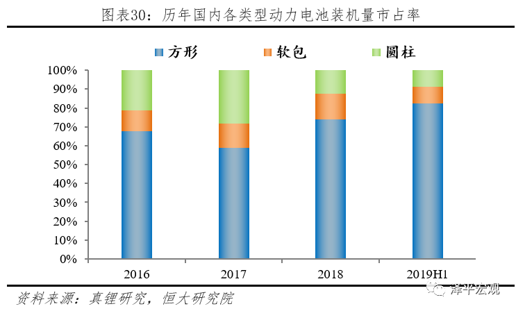 方形动力电池是当前市场主力,占比超过八成。据真锂研究统计,2019年上半年国内动力电池装机量29.80GWh,其中方形、软包、圆柱动力电池装机量分别为24.56、2.60、2.65GWh,对应占比82.4%、8.7%、8.9%。从趋势上看,方形占比持续提升,从2016年67.60%提升到2019H1的82.4%。因沃特玛“爆雷”,圆柱占比在2017年之后急剧缩小。