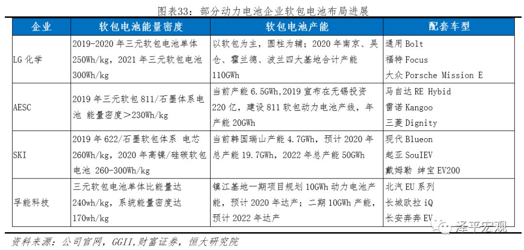 成组效率不佳、成本偏高、产品一致性差等问题造成软包电池商业化进程偏慢,但软包电池的高能量密度、高安全性、高倍率特性使得软包具有很大的发展潜力。在消费领域,软包电池渗透率就超过70%。目前全球软包电池巨头LG化学等纷纷扩大产能,开发的软包电池已应用于日产、通用、大众、雷诺、现代、戴姆勒等主流车企。据EV sales统计,2018年全球新能源乘用车销量TOP10车型,软包电池配套占2款;销量TOP10车企中7家已采用软包动力电池方案。据GGII统计,2018年国内新能源乘用车上软包动力电池装机达5.1GWh,占比15.4%。随着配套软包电池新车型发布,预计软包未来市场占比提升。