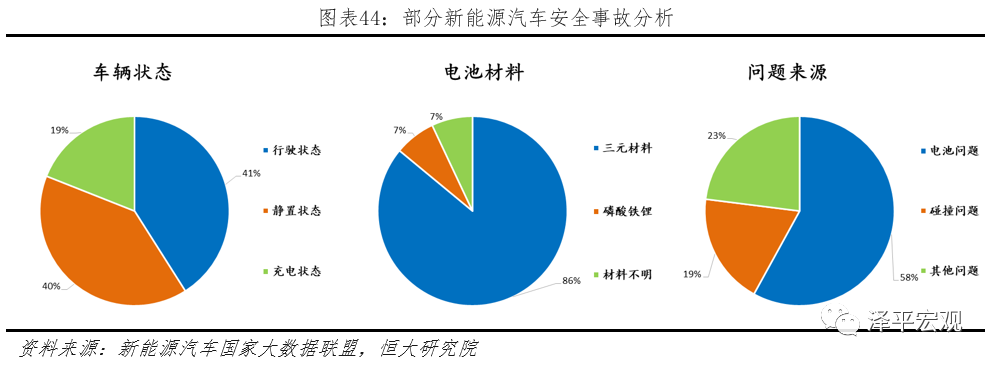 《2019新能源汽车消费市场研究报告》显示,电池安全问题是消费者放弃购买纯电动车第二大因素,占比高达26%。2019年8月,新能源汽车国家大数据联盟发布《新能源汽车国家监管平台大数据安全监管成果报告》披露,自2019年5月起到报告发布前,新能源汽车国家监管平台共发现79起安全事故,涉及车辆96辆。从车辆状态看,在已查明状态的车辆中,41%处在行驶状态、40%处在静置状态、19%处在充电状态;从电池材料看,86%使用三元(与三元材料市场占比高有关)、7%使用磷酸铁锂、7%电池类型不确定;从原因来看,在已查明起火原因的车辆中,58%车辆起火源于电池问题,19%车辆起火源于碰撞问题,剩余部分车辆起火源于浸水、零部件故障、使用问题等原因。