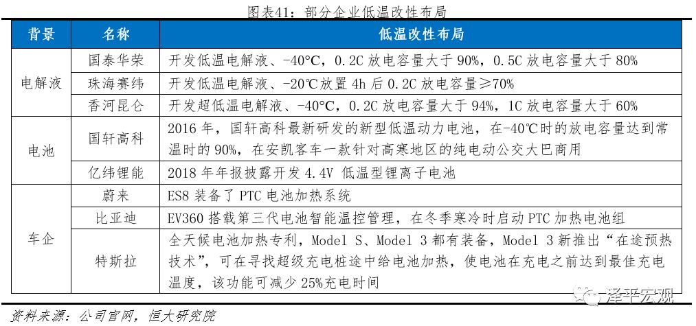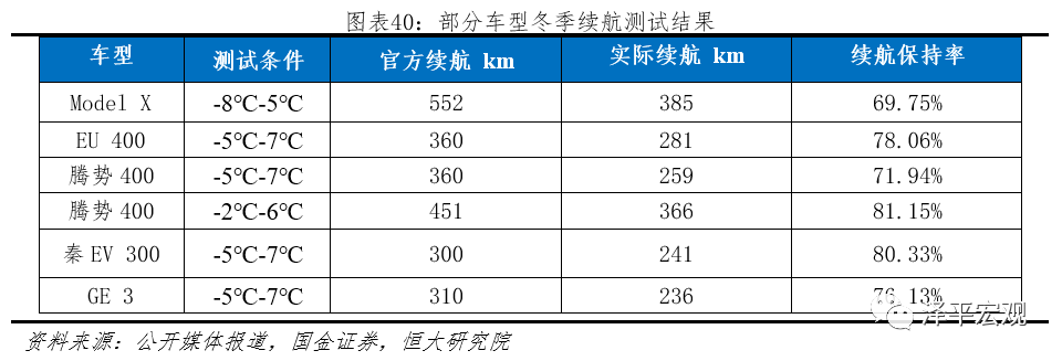 低温不仅降低材料的反应活性,而且会造成电解液凝固、离子迁移率降低、极化电压增大等。应用到动力电池,低温就会造成:1)放电容量降低(部分Li+来不及反应);2)倍率性能下降(电解液接近凝固,离子迁移率下降);3)放电平台降低(电池阻抗增加,极化电压增大)。根据部分代表车型冬季续航测试结果可以发现,在0℃左右的情况下,电动车续航会下降20-30%左右。