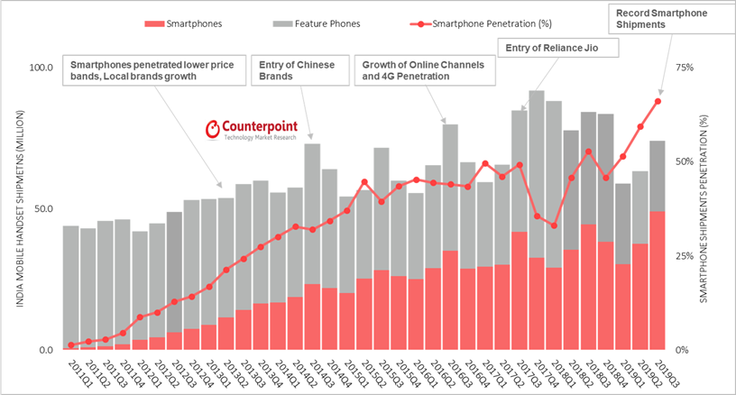 Counterpoint市场监测服务的最新研究显示,尽管经济放缓,但2019年第三季度印度智能手机出货量创历史新高,同比增长10%。排灯节前新机上市、打折促销和领先智能手机品牌为渠道备货推动了这一增长。