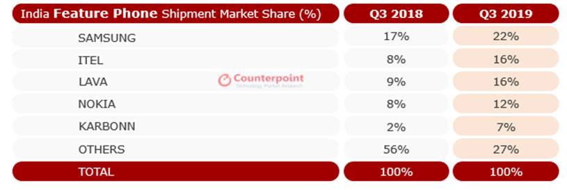 图3:2019年第三季度印度功能手机市场份额
