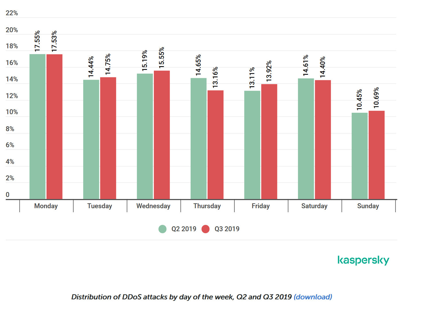 上个季度,DDOS僵尸网络活动峰值出现在7月份;最危险的一天是星期一,占攻击量的17.53%,最安静的是周日,仅占10.69%。