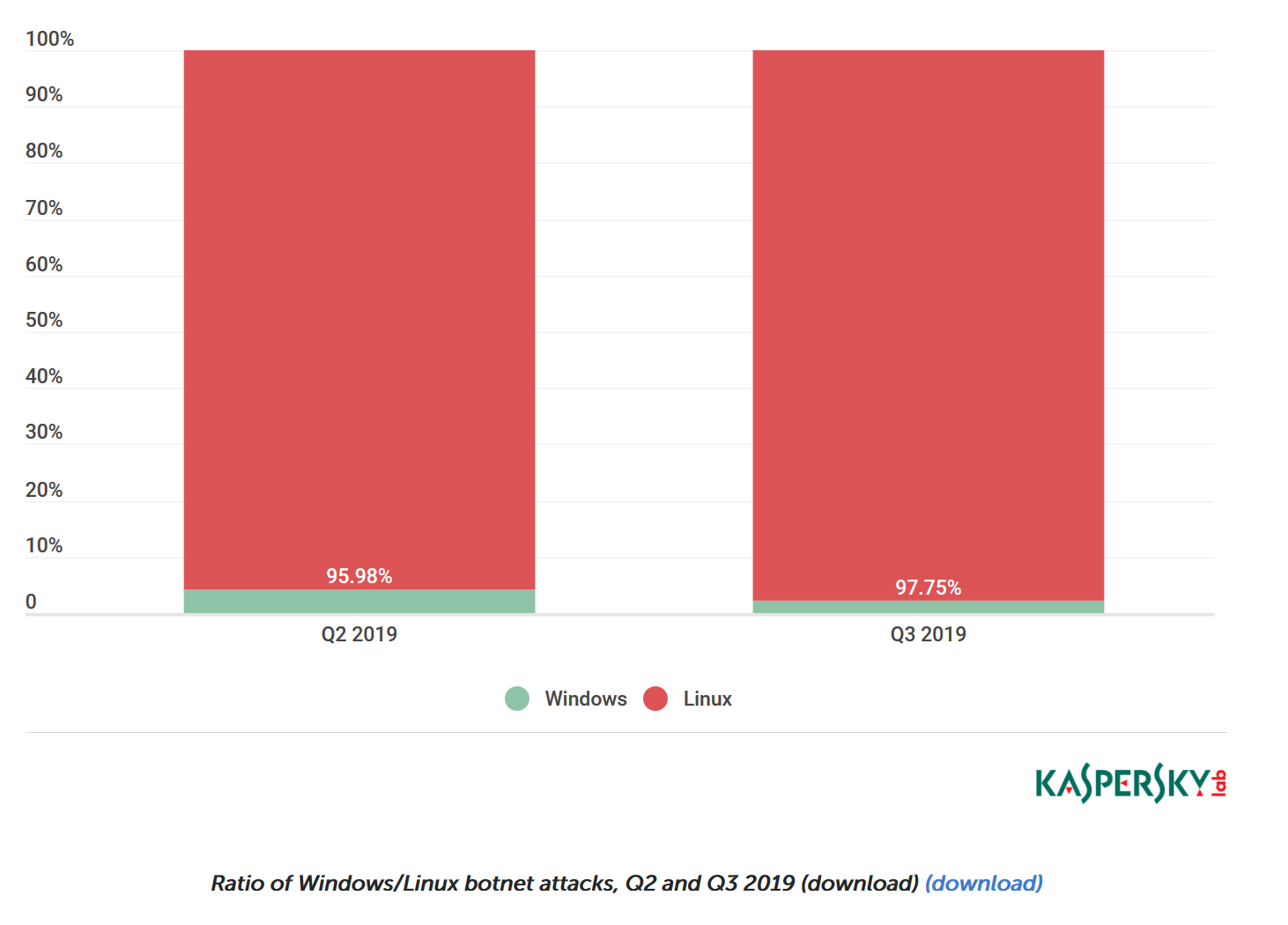 Windows和Linux僵尸网络的份额与第二季度相比几乎没有变化;Linux僵尸网络仍占攻击活动的绝大多数(97.75%)。