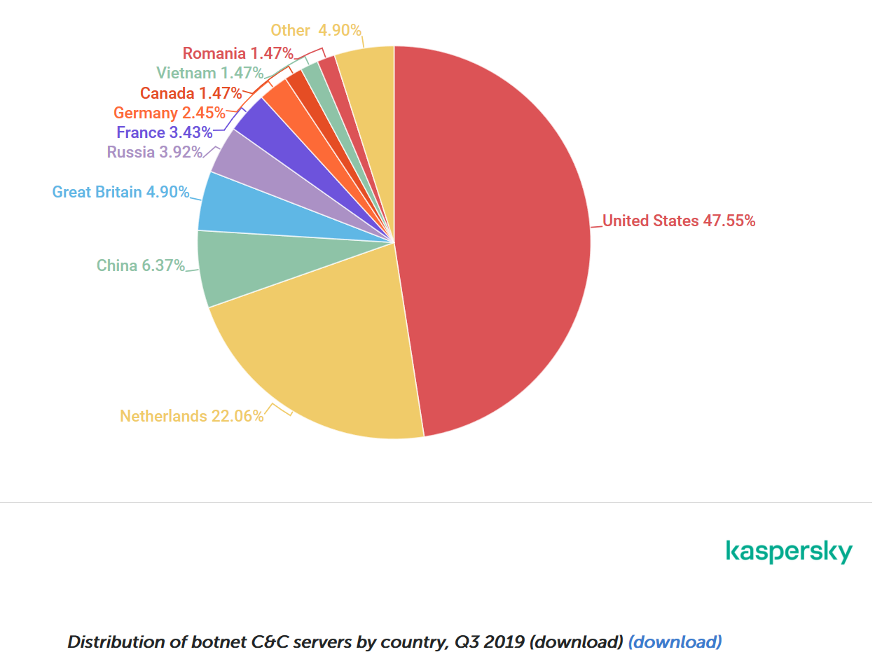 僵尸网络C&C服务器数量再次领先,尤其是在美国(47.55%)、荷兰(22.06%)和中国(6.37%)。