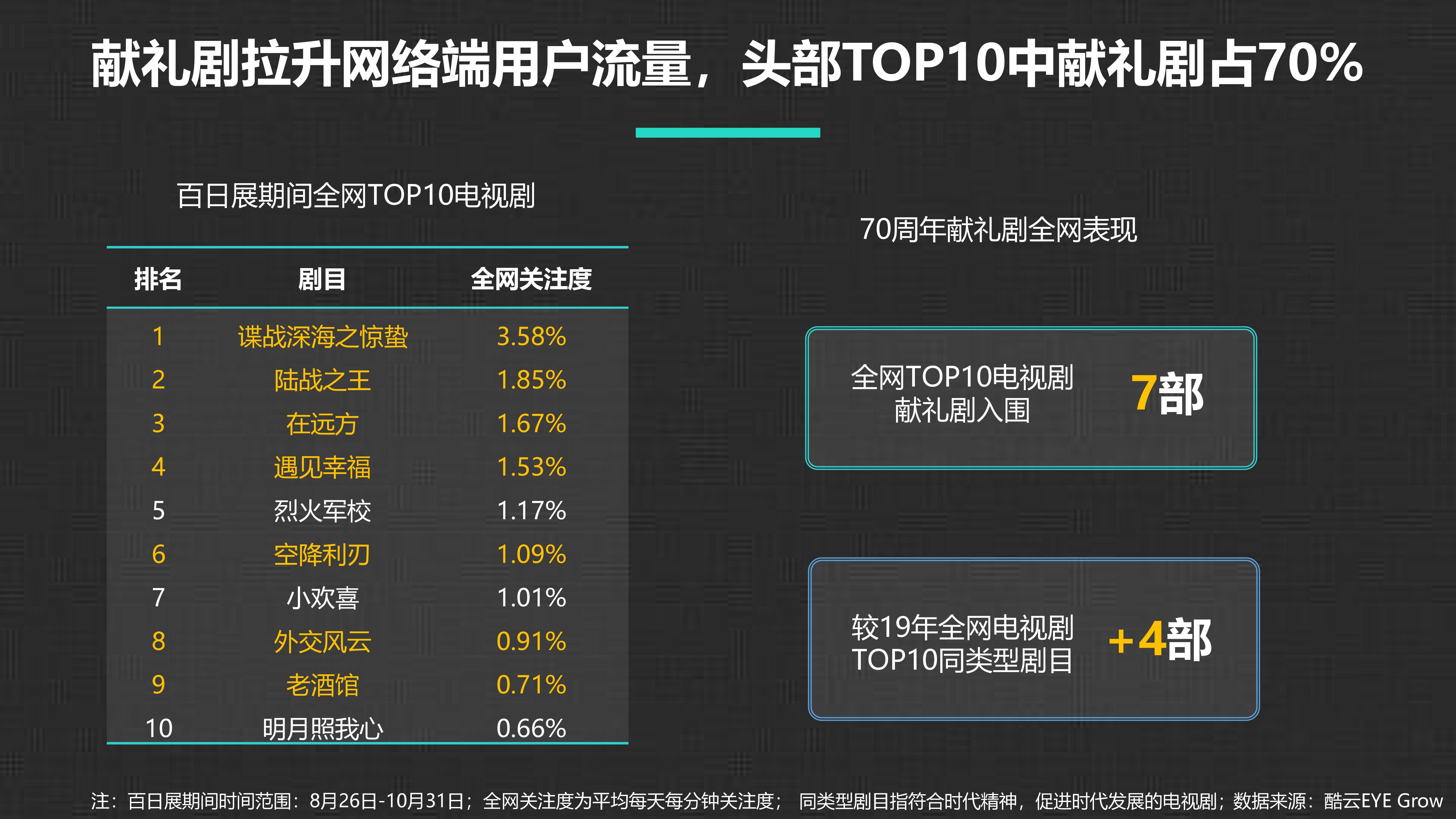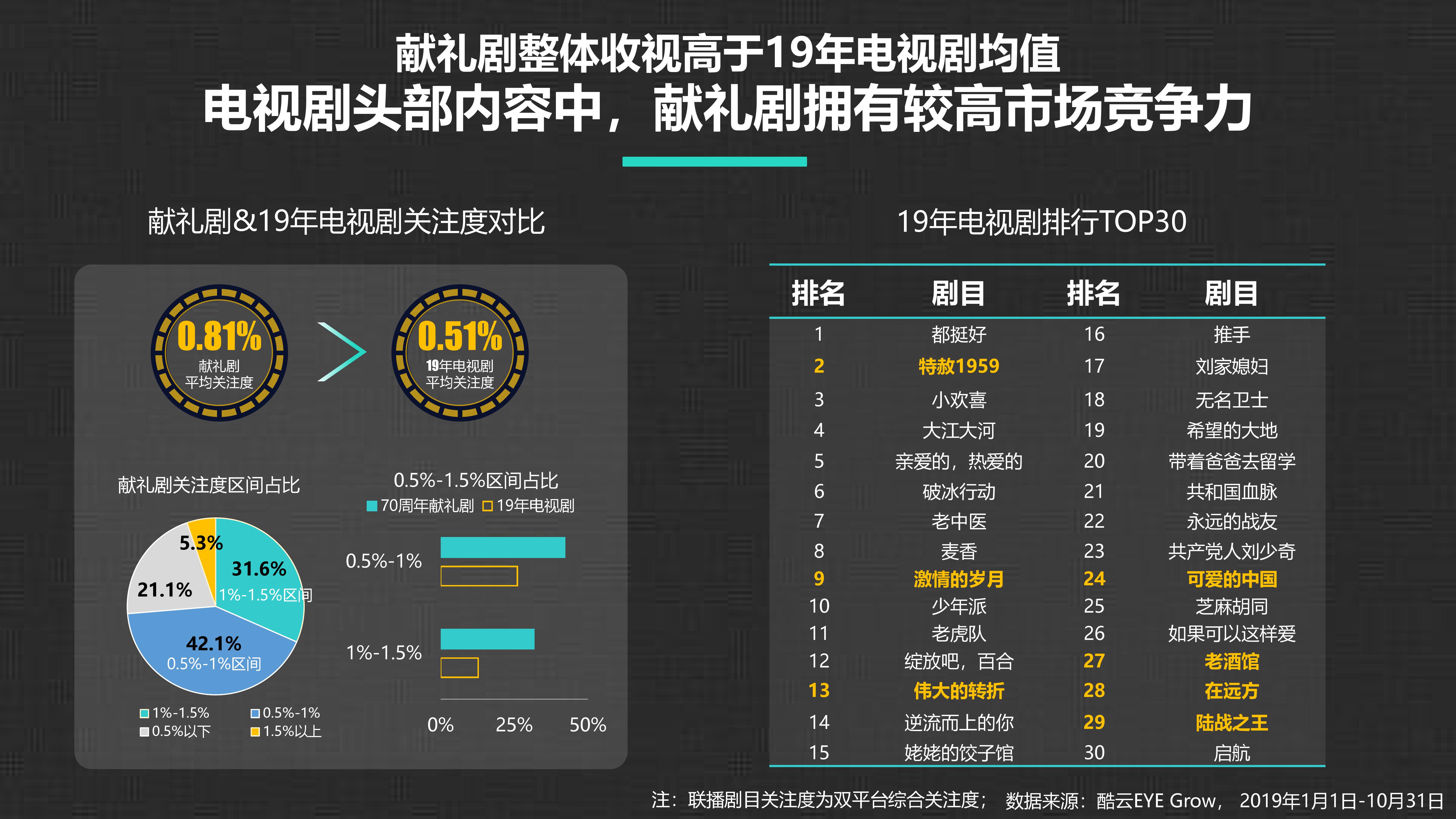 酷云互动:70周年献礼剧洞察报告 更多阅读:酷云互动:2020年1-4月明星影响力洞察报告酷云互动:中国电视用户家庭差异洞察报告酷云互动:甜宠剧分析报告Facebook:2021年游戏营销洞察报告酷云互动:2020年4-5月智能电视广告投放月度风向标酷云互动:从现在到未来 大数据正在革新文娱产业德勤咨询&京东:中国汽车后市场物流服务洞察报告埃森哲:2018中国旅游业洞察报告下一站去哪儿:中国千禧世代旅行者洞察报告InMobi:2017化妆品移动营销洞察报告360智库:2016年中国互联网用户消费行为洞察报告今日头条:2017信用卡兴趣人群洞察报告酷云互动:疫情下的用户大屏触媒洞察分析酷云互动:用户大屏触媒洞察分析酷云互动:2020年7-8月智能电视全场景月度风向标