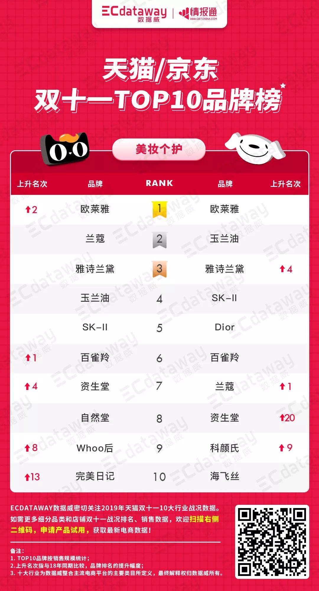 美妆个护今年的整体排名有了不小的变化。Whoo后作为韩系代表,天猫排名相较去年上升8名;完美日记更是作为彩妆类目TOP1,天猫整体行业排名上升13名。而纵观京东平台,今年资生堂以20名的增幅成为排名上升最快品牌,科颜氏以9名的排名增幅紧随其后。