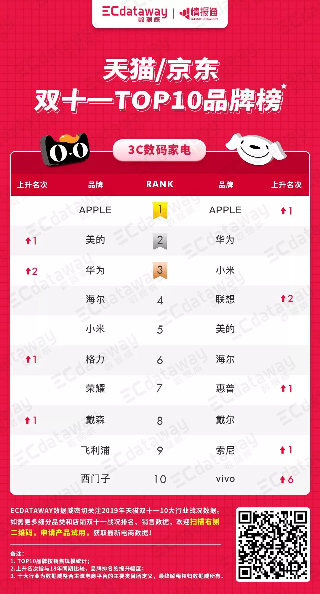 在3C数码家电行业中,苹果在天猫与京东平台均排名第一,品牌溢价空间高;3C数码家电行业是京东的传统强势行业,在品牌榜中,vivo表现强势,较去年同期上升了6名。