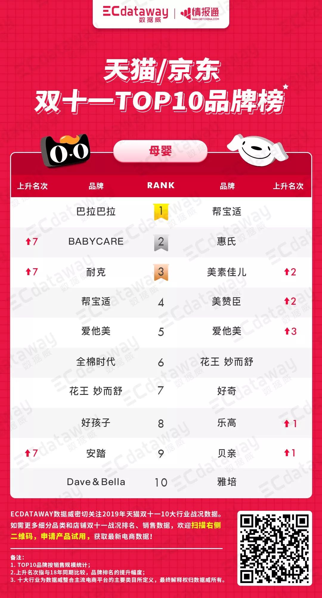 纵观母婴行业,童装童鞋、婴童用品品牌更倾向天猫平台,Babycare、耐克与安踏对比去年同期排名均上升了7位;在京东平台,婴幼儿奶粉与纸尿裤更受消费者青睐。