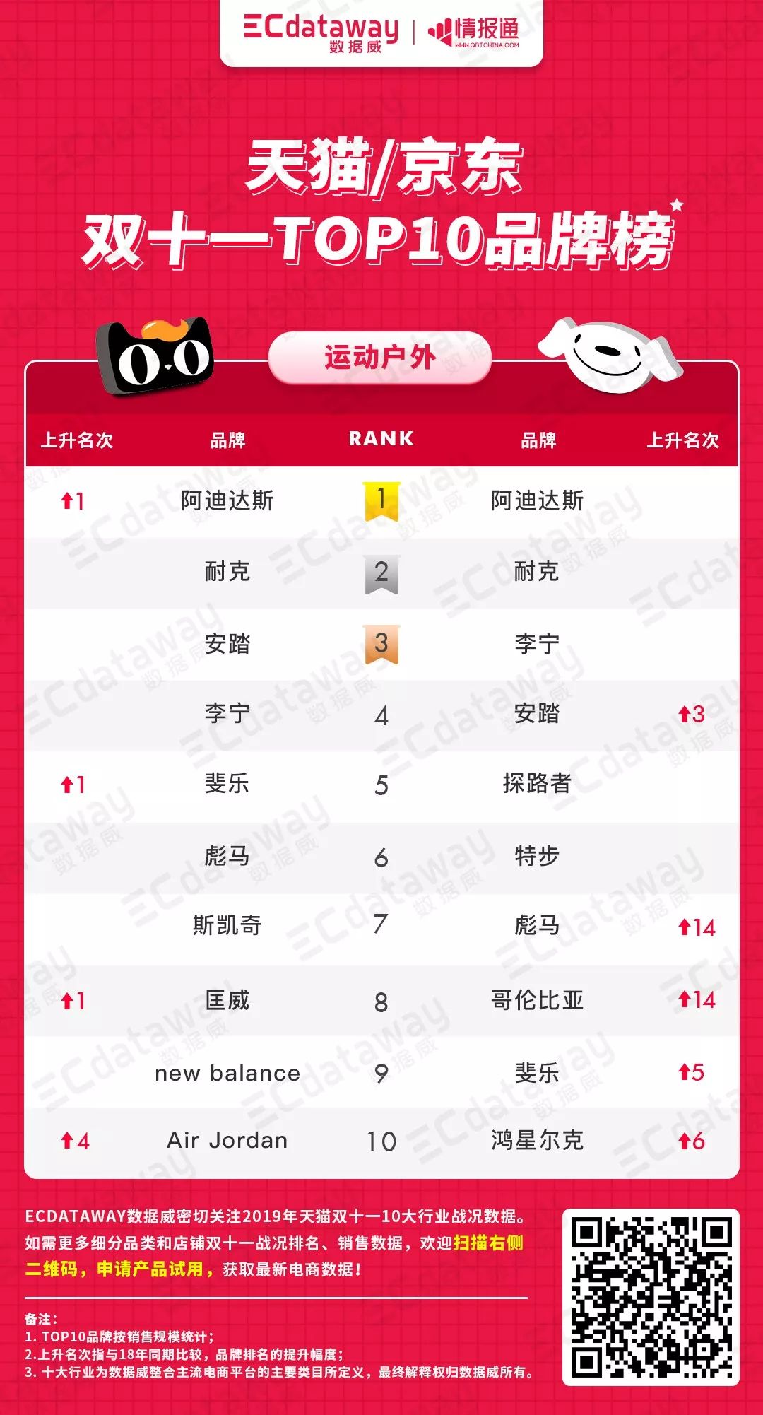 运动户外行业TOP品牌以国际大牌为主。在天猫与京东平台,阿迪达斯与耐克均排名第一第二位;Air Jordan在天猫平台上升4位跻身TOP10品牌;彪马与哥伦比亚在京东平台表现抢眼,排名较18年同期上升14位。