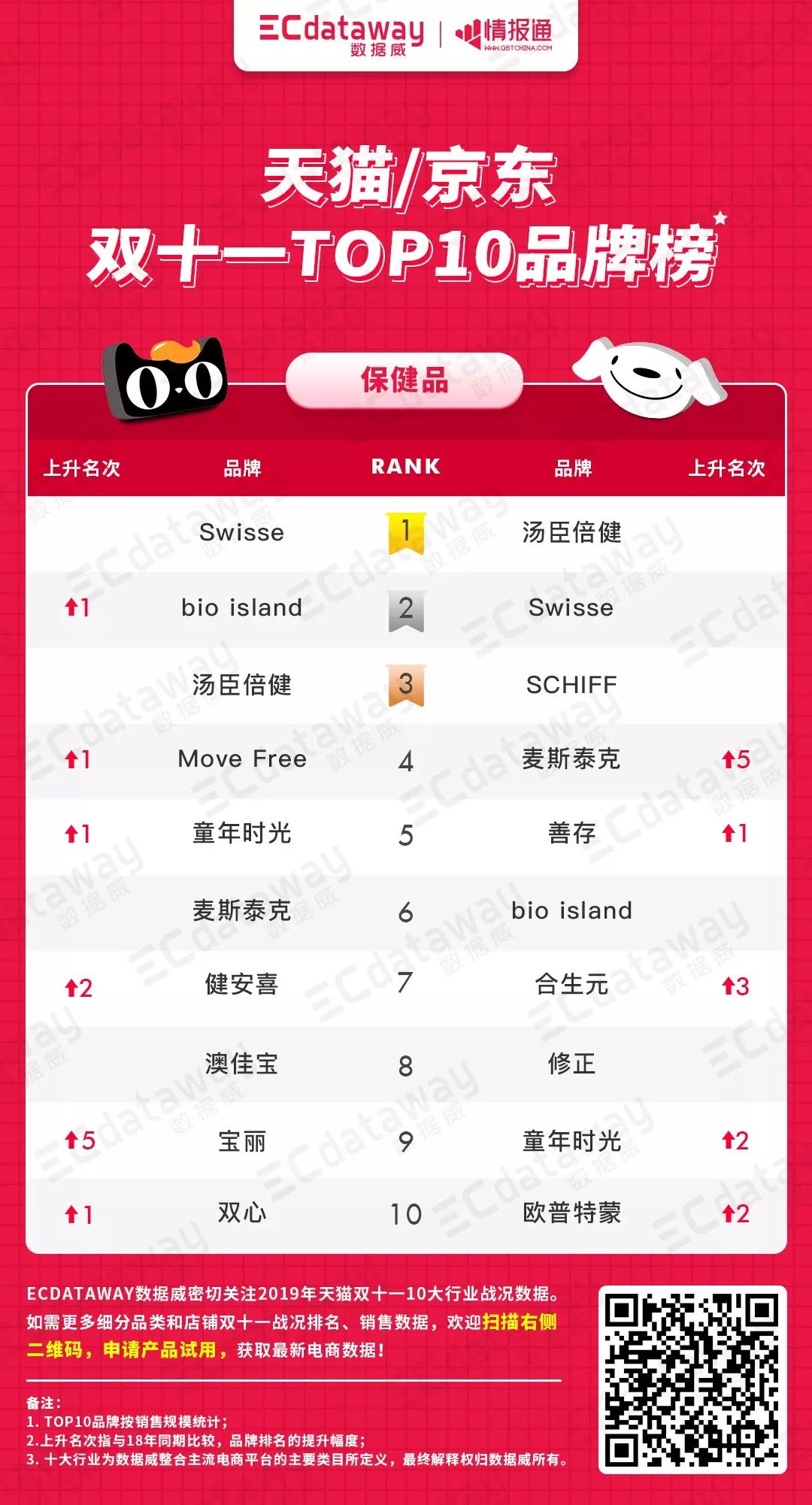 针对保健品行业,消费者对品牌产品的功能性、场景化需求更多元;产品成分和功效是值得深挖的产品属性。而在京东上,汤臣倍健则是本次双十一的一把手位置;蛋白粉品类在京东TOP10排名中已出现两个品牌(麦斯泰克和欧普特蒙),体现了该品类的市场潜力。