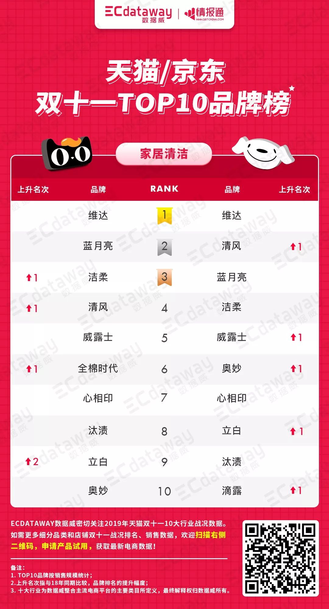 可以看到,家居清洁行业在天猫和京东上面的头部品牌契合度依旧很高。维达表现稳定,摘得双平台TOP1;清风和立白同样是在双平台上排名都上升1位,于本次双十一收获不俗战绩。