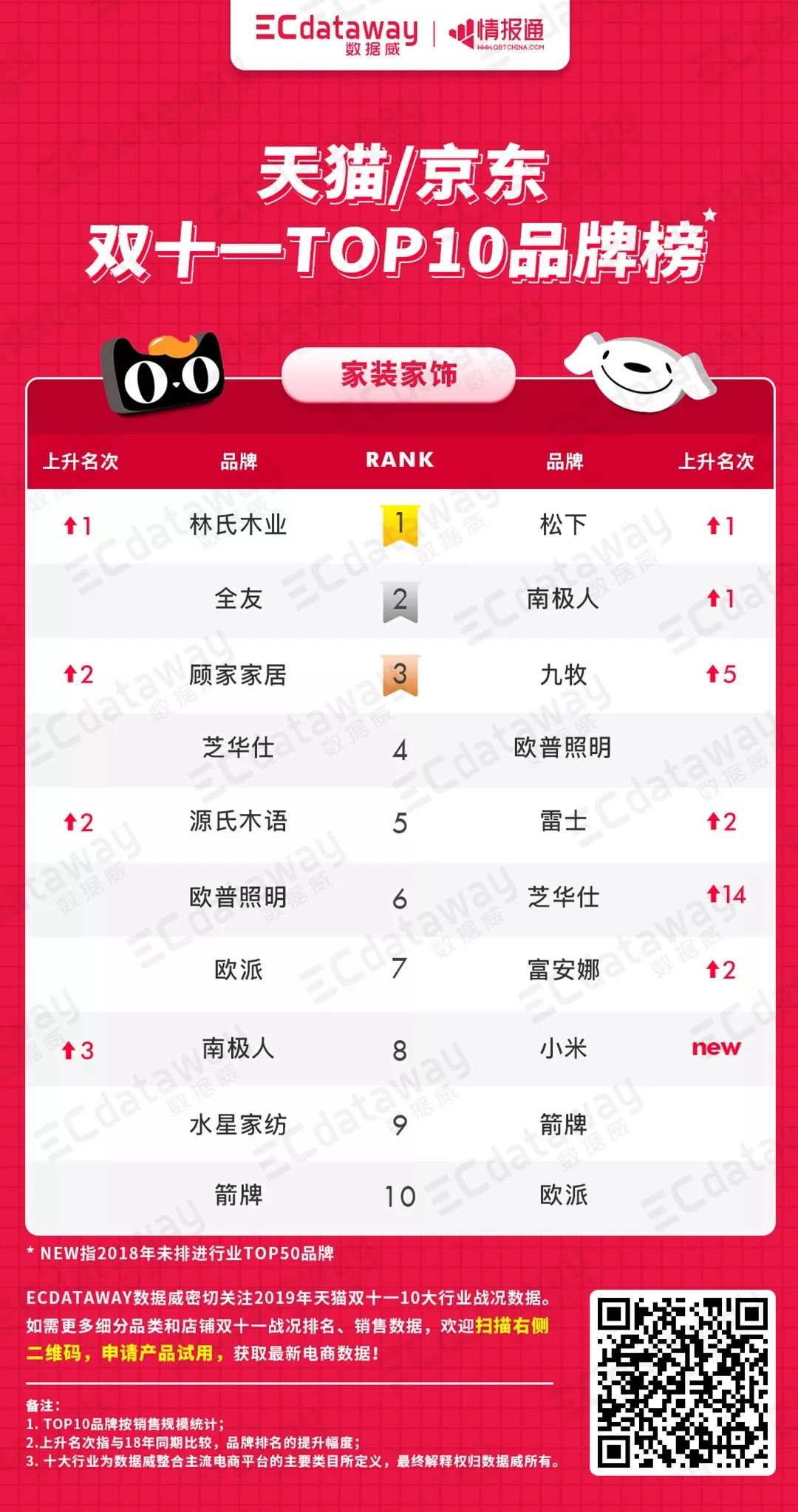 家装家饰在天猫平台上的双十一战绩总体表现稳定,品牌基本呈小幅变动趋势,林氏木业今年超过全友,成为天猫行业第一。而在京东平台上,小米和芝华仕今年发力强劲,同比去年排名上升皆超过10位。