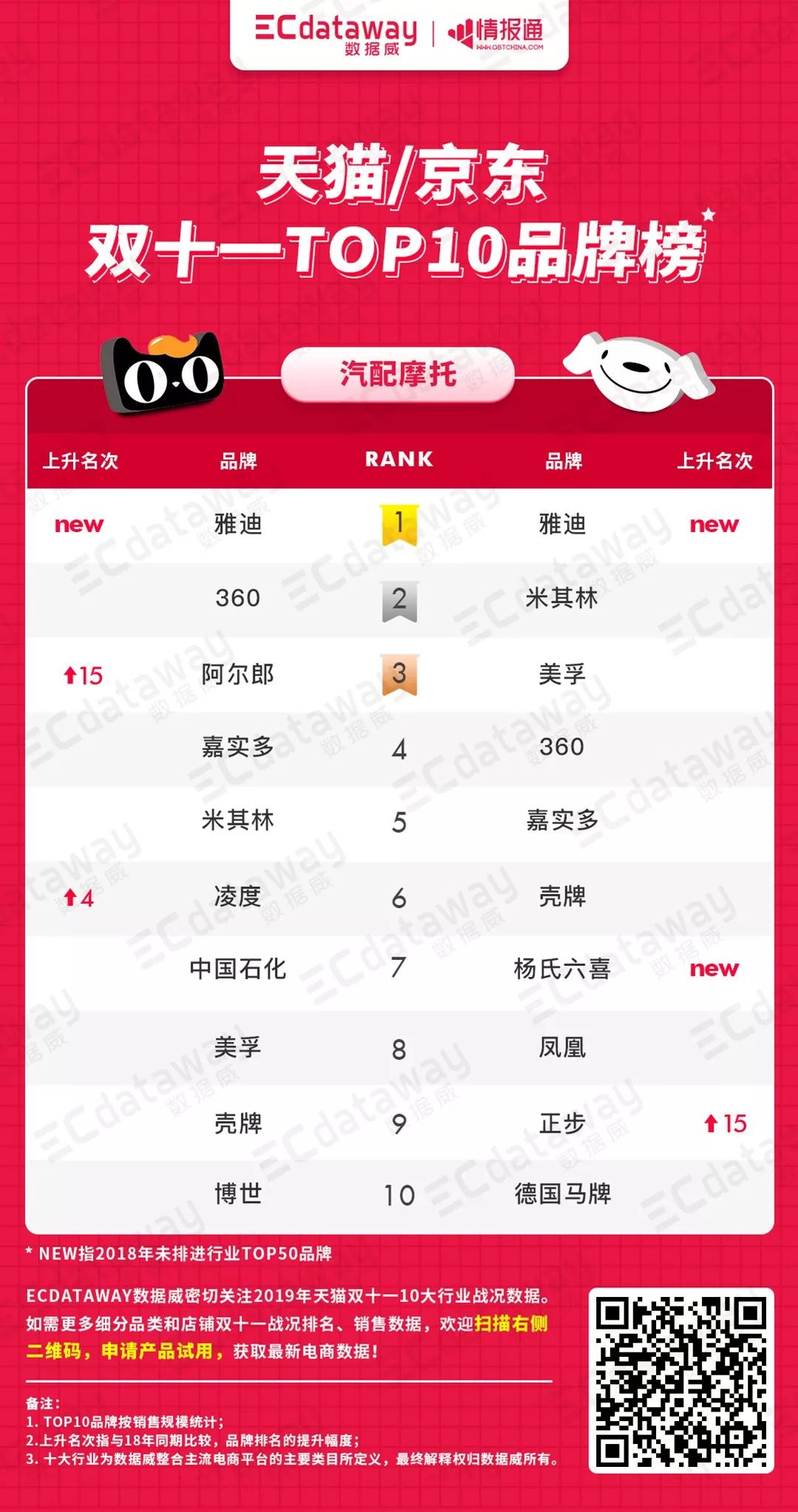 汽配摩托行业中,雅迪表现出色,作为新上榜品牌,在天猫与京东平台均荣获第一的宝座,可喜可贺。