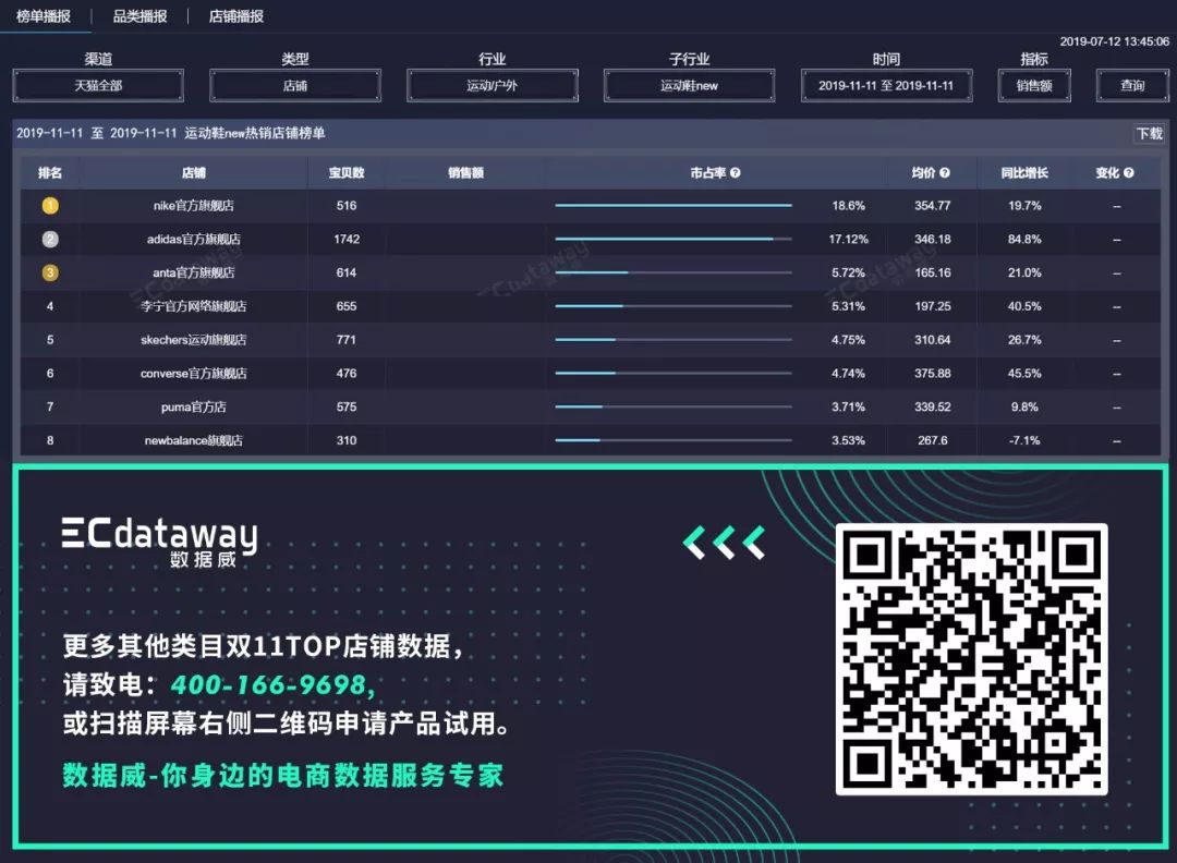 除了以上榜单播报,数据威更是为大家带来了更多的细分品类热销店铺数据,如下图所示,在运动户外行业下运动鞋New(阿里同名类目)品类中,排名第一的是Nike官方旗舰店,数据维度覆盖店铺热销宝贝数、市场份额、成交均价等,以智能BI看板形式呈现,满足一键洞察自身品牌与竞品在双11的具体表现与排名情况。