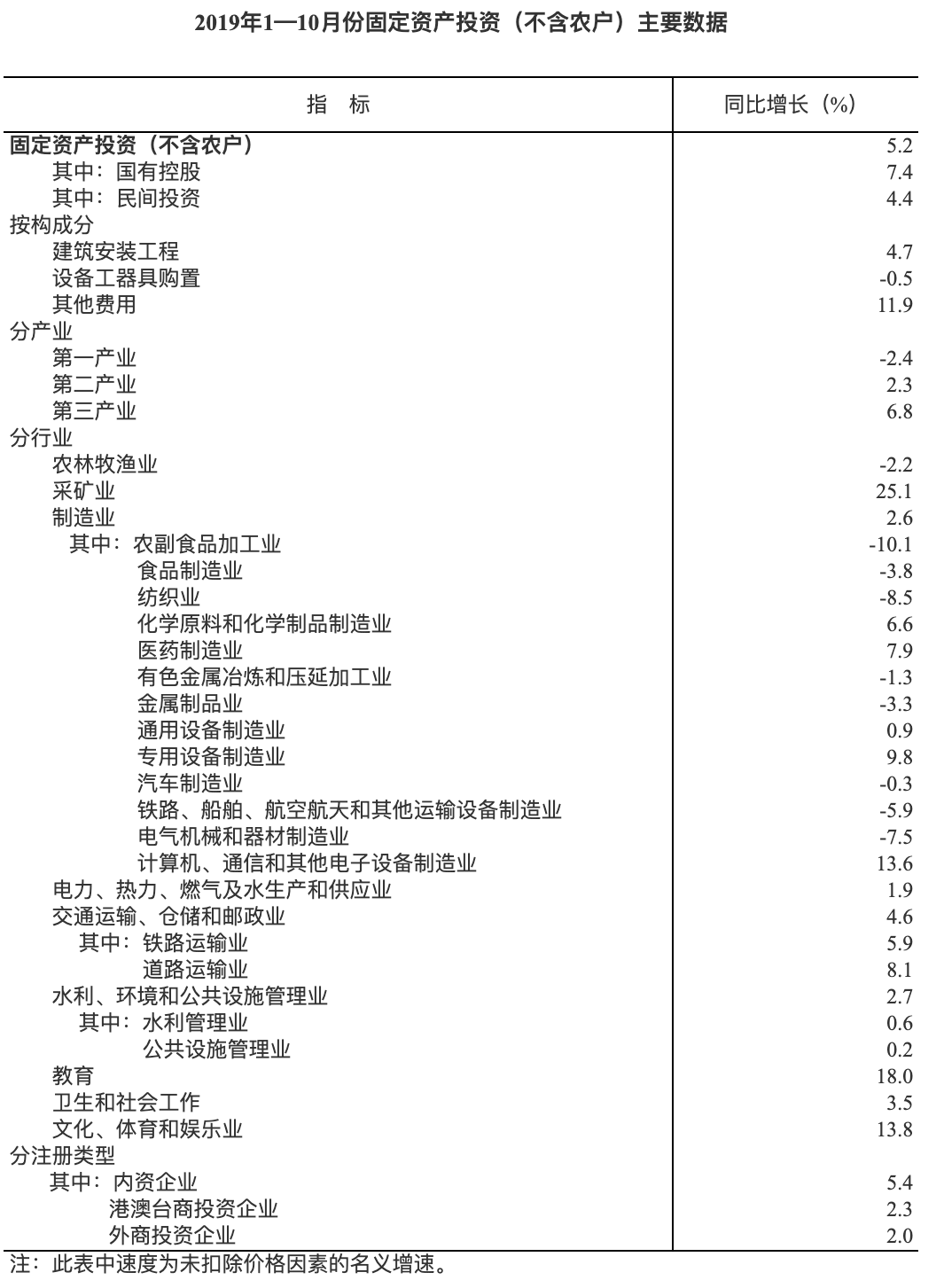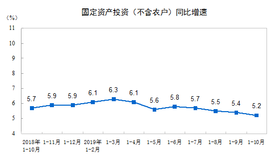 2019年1—10月份,全国共完成固定资产投资(不含农户)510880亿元,同比增长5.2%,增速比前三季度回落0.2个百分点。1—10月份固定资产投资运行呈现以下特点: